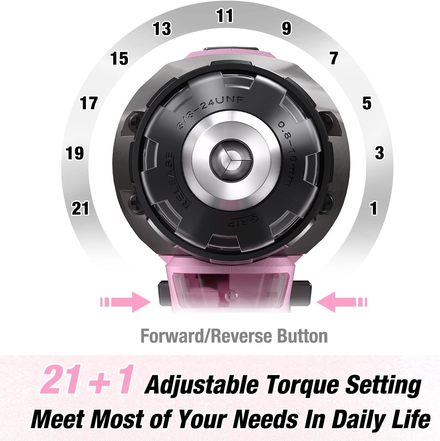 ? Gift for Men and Women, Husband, Friend, DIYer ? Pink Ribbon: WORKPRO Tools is donating $0.25 from this purchase to National Breast Cancer Foundation, INC.. NBCF is Helping Women Now by providing early detection, education and support services to those affected by breast cancer High Performance - Our cordless drill driver is powered by a max 20 voltage, 1.5AH Lithium-ion battery for strong and steady power and an endurable run time. The battery is simple to change and charge. The drill is designed with variable 2-speed settings (0-400 rpm and 0-1500 rpm) for multiple purposes 21+1 Torque Adjustment with Larger Chuck- Your new brand cordless drill, delivering 203 in-Lbs (23N.M) of max torque, features 21+1 torque position clutch,which provides more precision of torque adjustment as needed. Large 3/8"(10mm) keyless chuck can provide you superior bit retention Super Safe Comfortable to Use - Our drill tool is built with a soft grip handle for added comfort and gives you total control of the tool without heavy fatigue while using. Comes with LED light for extra security and safety when you work in dark areas. Notice: please make sure the drill driver is fully charged before the first use Notice - This is a carbon brushes drill. Most new DC motor tools and new carbon brushes have sparks, which will be smaller over time, as long as it's not a malfunction or the spark gets bigger and bigger. The spark is slightly larger when the tool started because of the high starting current, but it will be more uniform when it start working