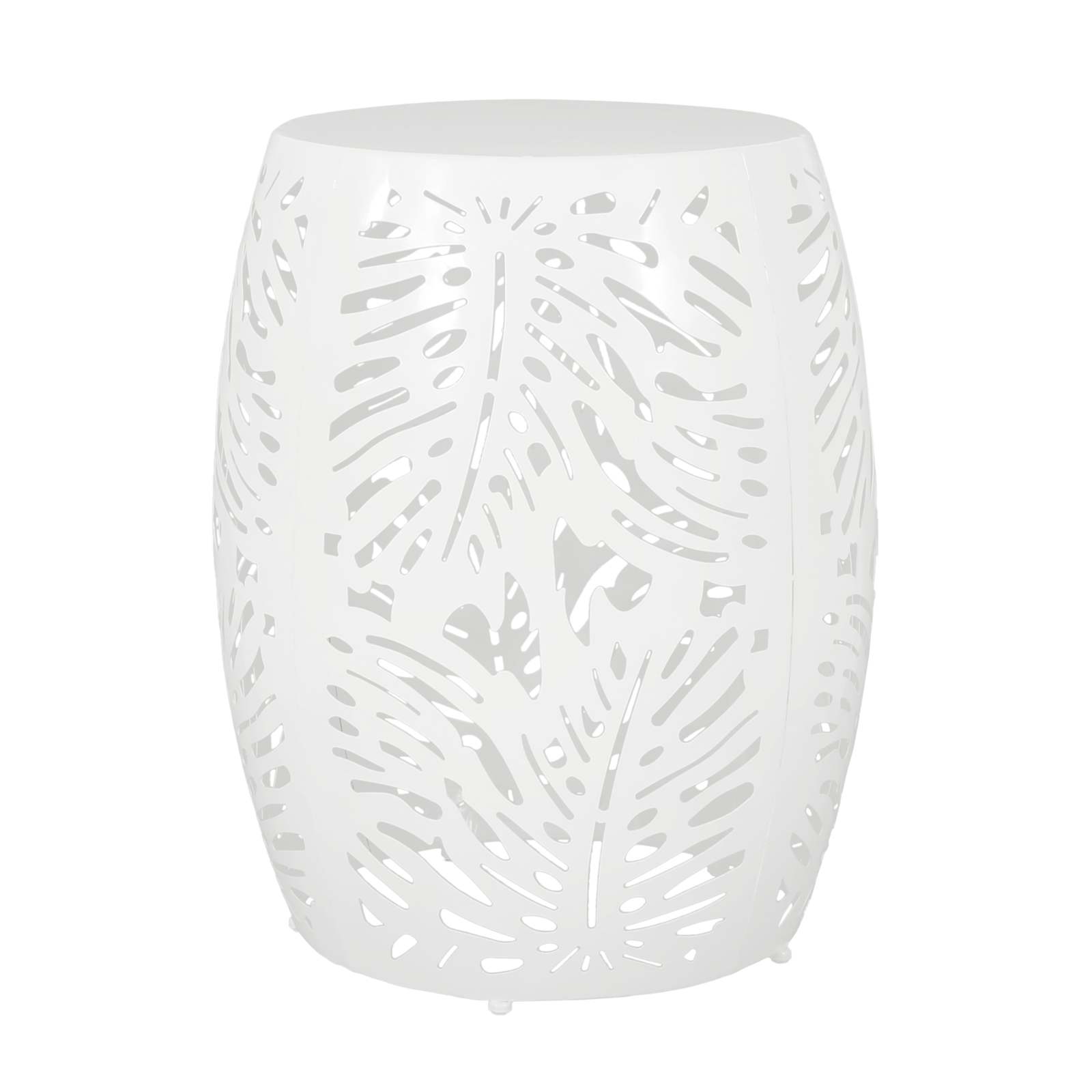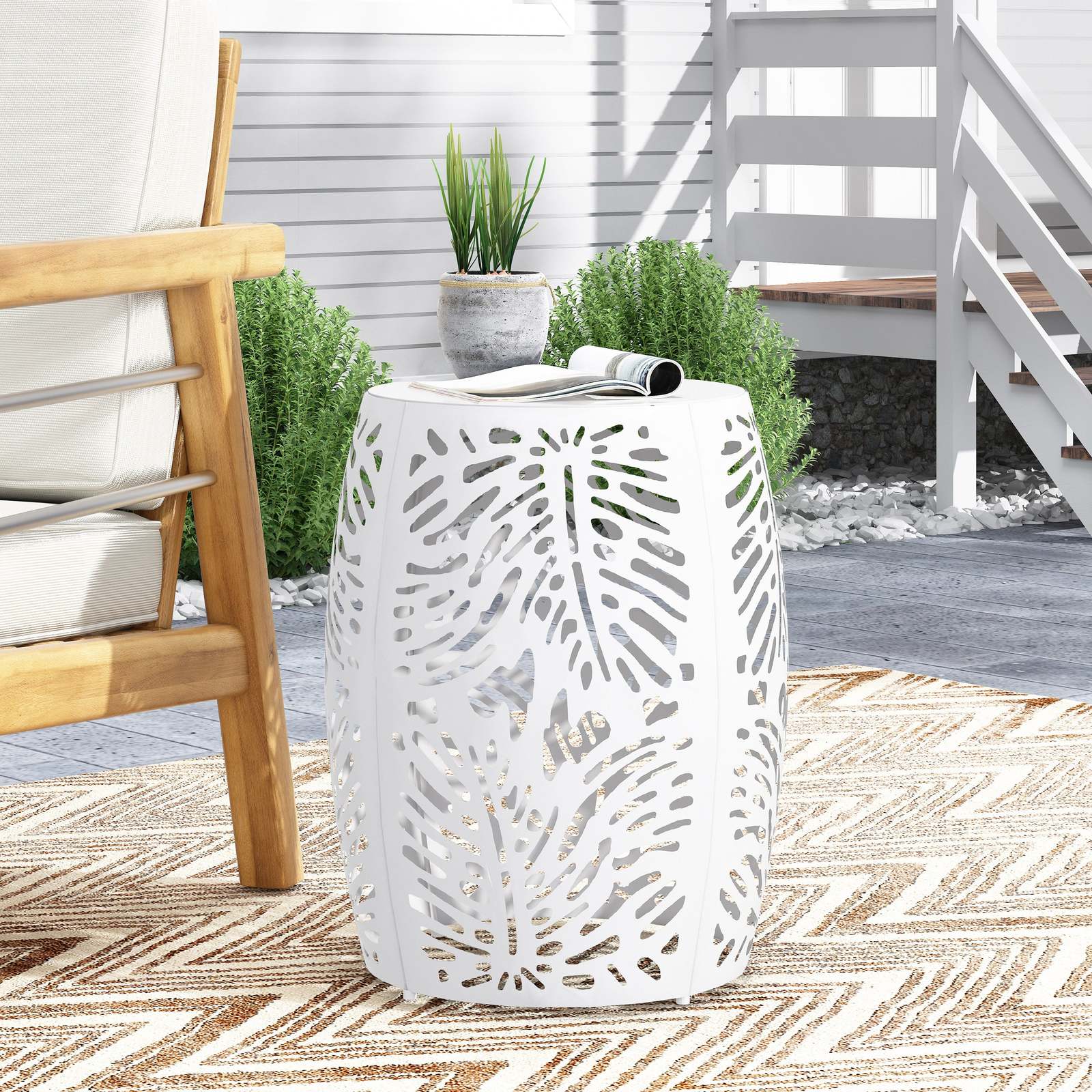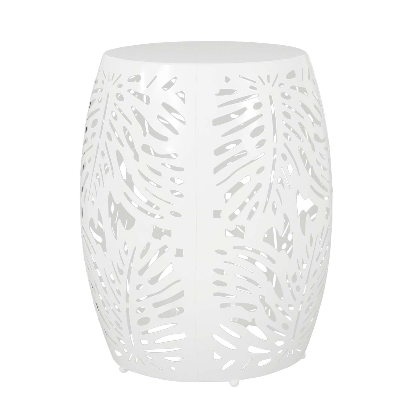An iron cut design on the side of the table forms a tropical palm leaf pattern while allowing light to pass easily through its frame, and utilizes a barrel structure and hollow framework, bringing airy appeal to your seating arrangement, while the smooth top provides a perfect perch for pitchers of