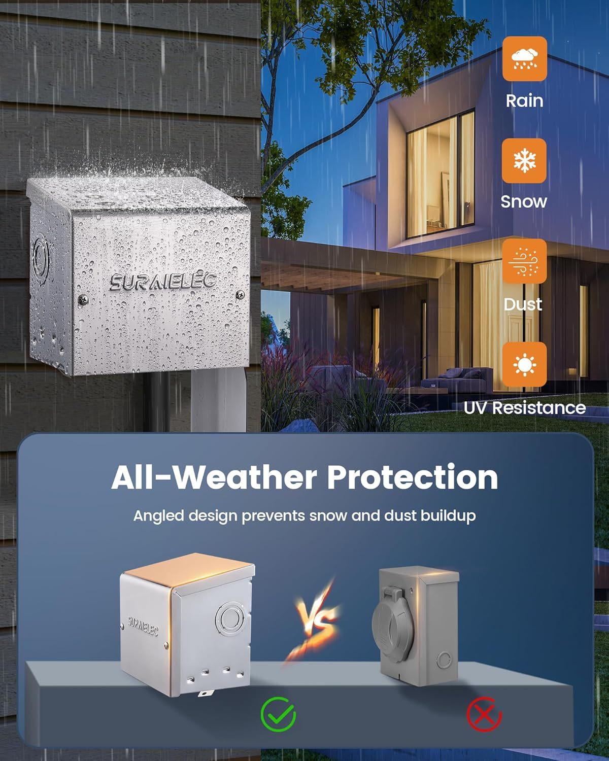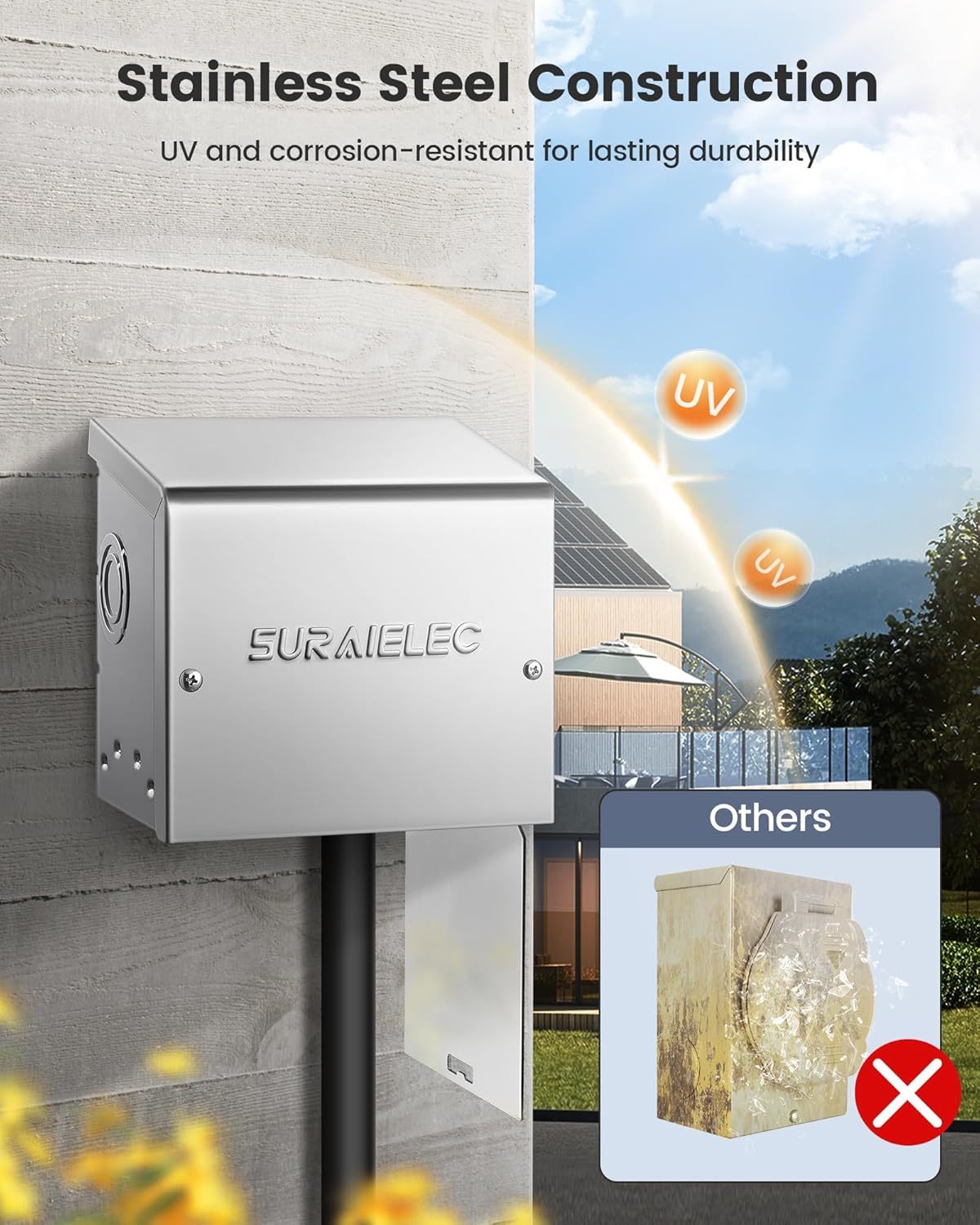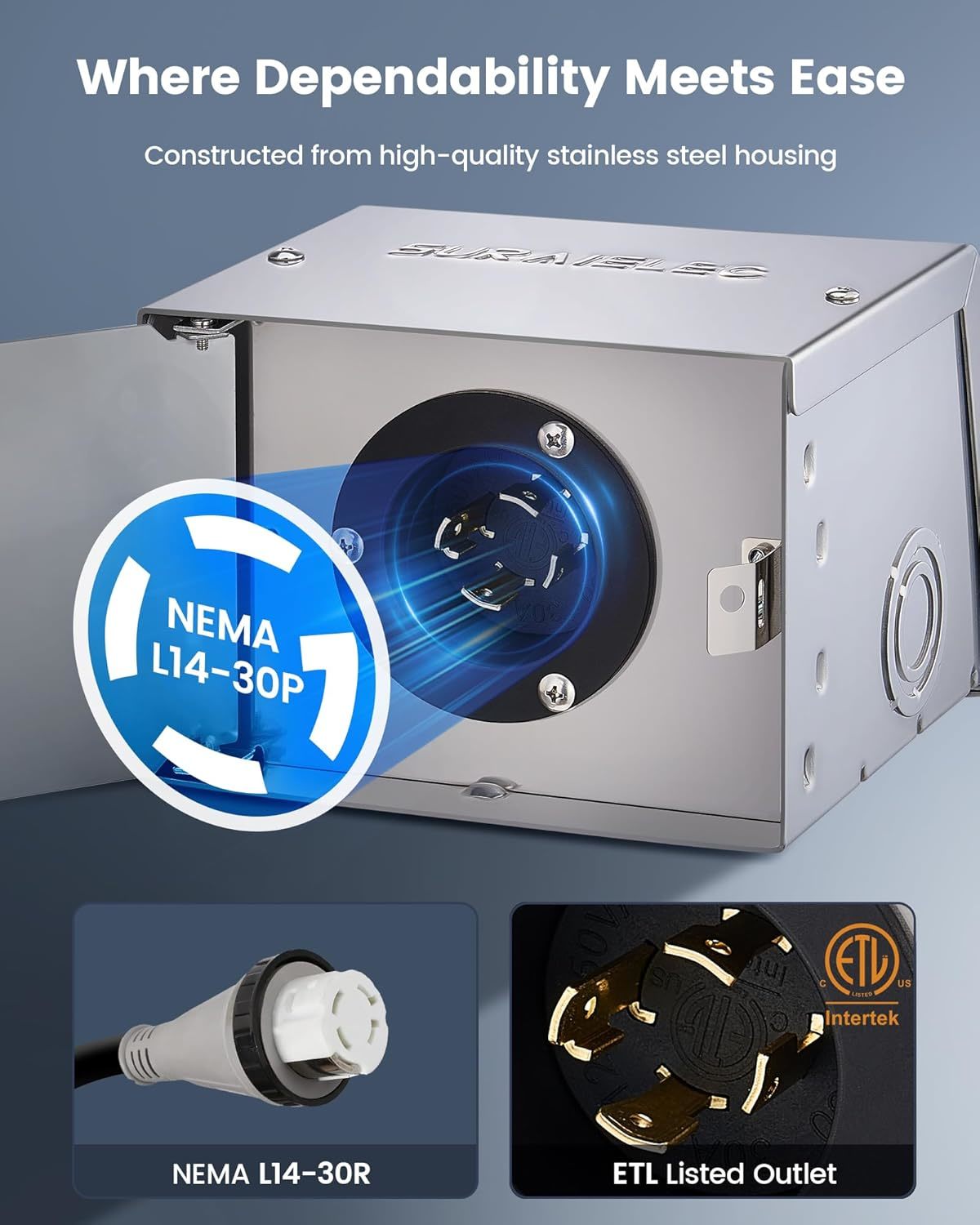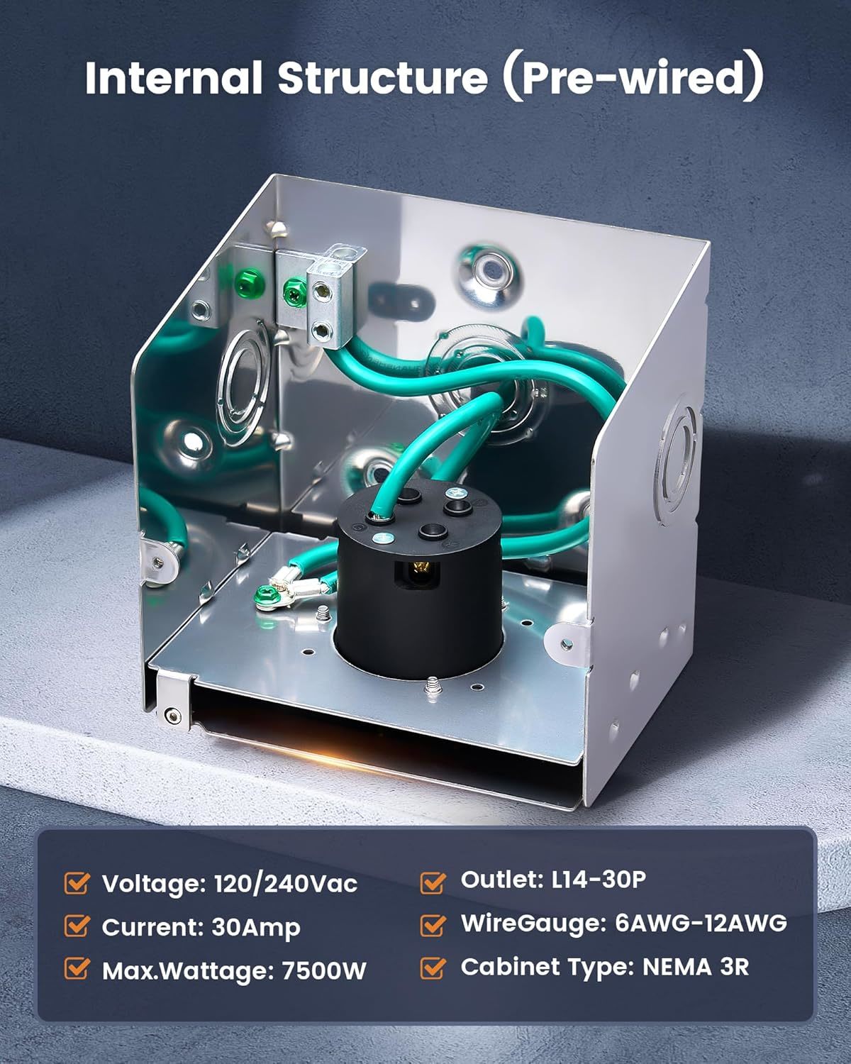 Generator Power Inlet Box: Our power inlet box is an outdoor electrical inlet for a 30 Amp L14-30 generator cord, rated for 7500W and compatible with 6-12 AWG wire. It features a 3R enclosure, making it a rainproof generator inlet box receptacle for top-notch safety and performance Weatherproof Stainless Steel Housing: Crafted from robust stainless steel for superior durability and corrosion resistance, outlasting plastic options; rated for wet locations to ensure dependable performance in all weather conditions Unique Bottom-Facing Outlet: Featuring a bottom-facing outlet, our outdoor generator box uses specially designed cable entry holes to prevent debris from entering and nesting.This design ensures a secure, safe environment for your generator inlet box, enhancing equipment longevity Easy-to-remove Knockouts: Featuring easily removable knockouts on the sides and back of the NEMA L14-30P Power Inlet Box, with 3 knockout holes that can be directly connected to switches and distribution boards from multiple directions. The front panel is detachable, making installation highly convenient ETL Listed Outlet: ETL Listed for 30 Amp generator inlet box outlet, compatible with all 30 Amp NEMA L14-30 generator cords. Designed for outdoor installation, ideal for providing backup power during outages and severe weather