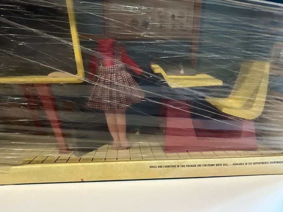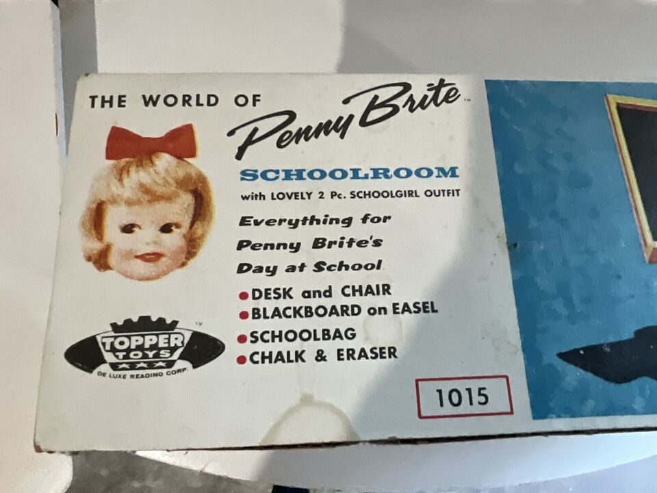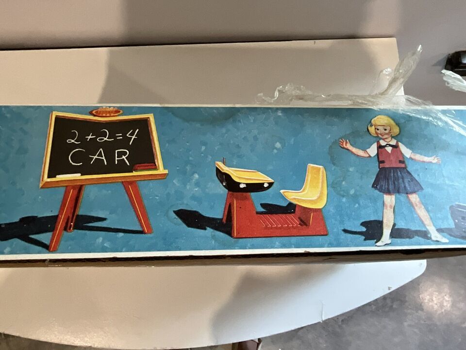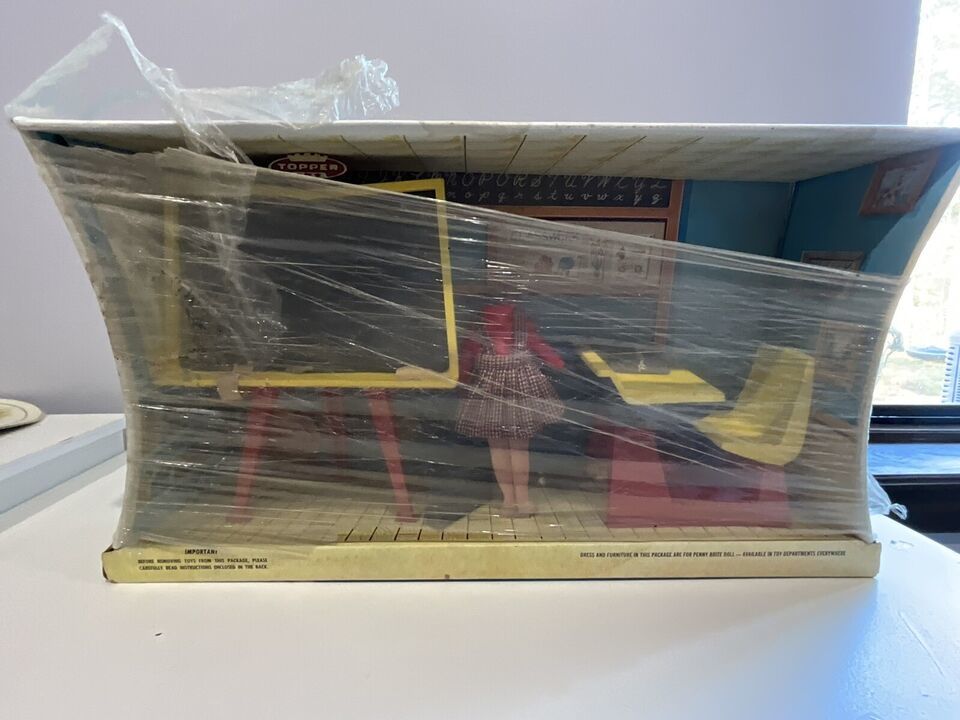 This is a beautiful vintage 1963 Penny Brite School Room set. It is in the original box and not played with. It looks like someone wrapped Saran Wrap around it to try and protect it, but it is open at top and bottom. The head to to cardboard Penny Brite doll is on the floor behind the chalkboard. I tried to get a picture, but it did not take well, but it is in the box. The woman that had this got this for Christmas and she said she remembered seeing it in the box and her mother placed in the attic, so she never got to play with it. I told her I would find this cute set a new home. There is some dust within the box due to the tears in the plastic but it is so cute and perfect for a collection!
