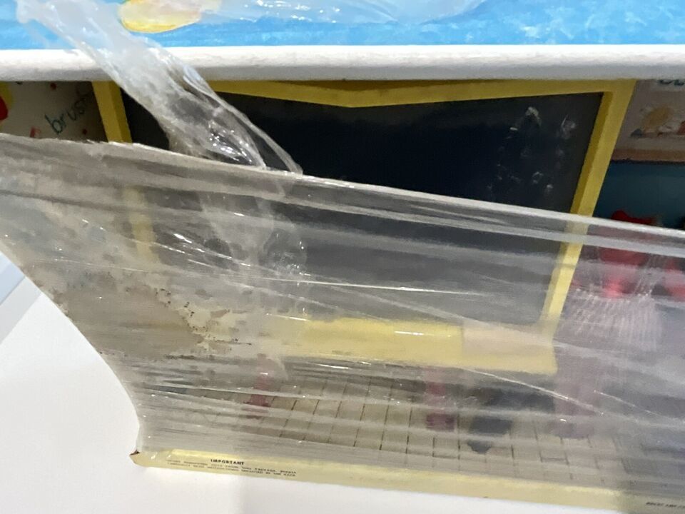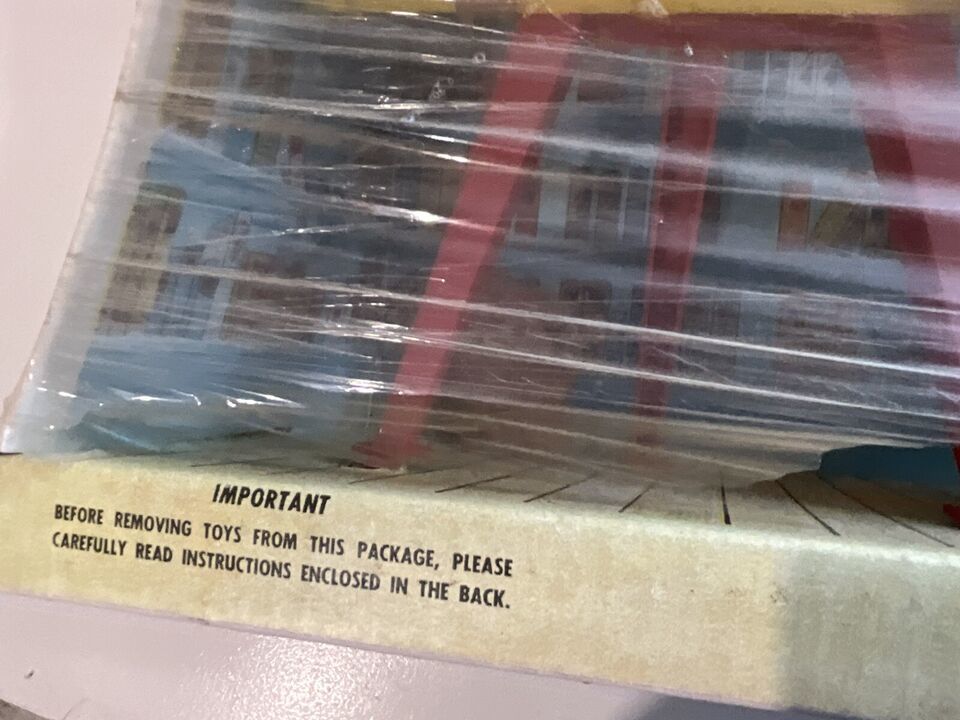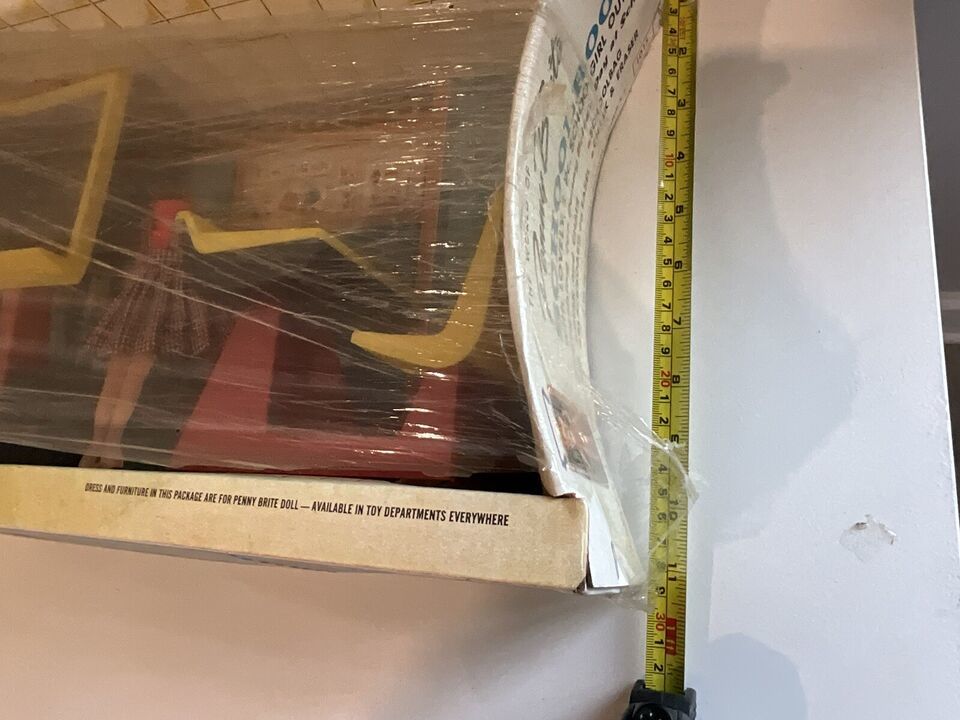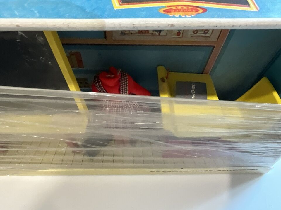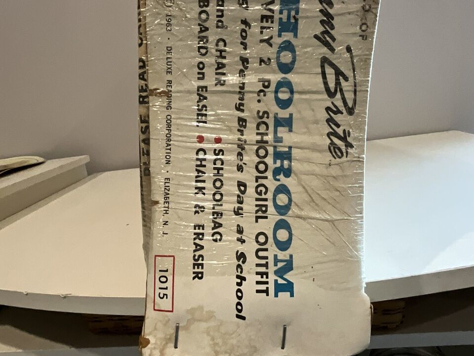 This is a beautiful vintage 1963 Penny Brite School Room set. It is in the original box and not played with. It looks like someone wrapped Saran Wrap around it to try and protect it, but it is open at top and bottom. The head to to cardboard Penny Brite doll is on the floor behind the chalkboard. I tried to get a picture, but it did not take well, but it is in the box. The woman that had this got this for Christmas and she said she remembered seeing it in the box and her mother placed in the attic, so she never got to play with it. I told her I would find this cute set a new home. There is some dust within the box due to the tears in the plastic but it is so cute and perfect for a collection!