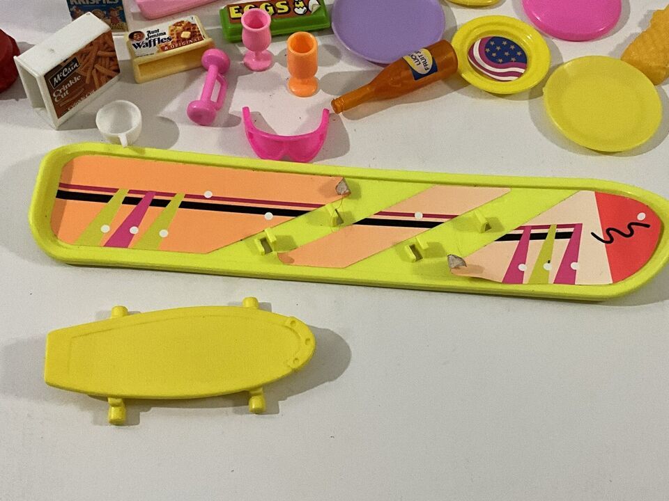 This is an assorted lot of over 30 Barbie and doll accessory items. There are food items, camping items, surfboards, and lots of different items. They all are in good condition.