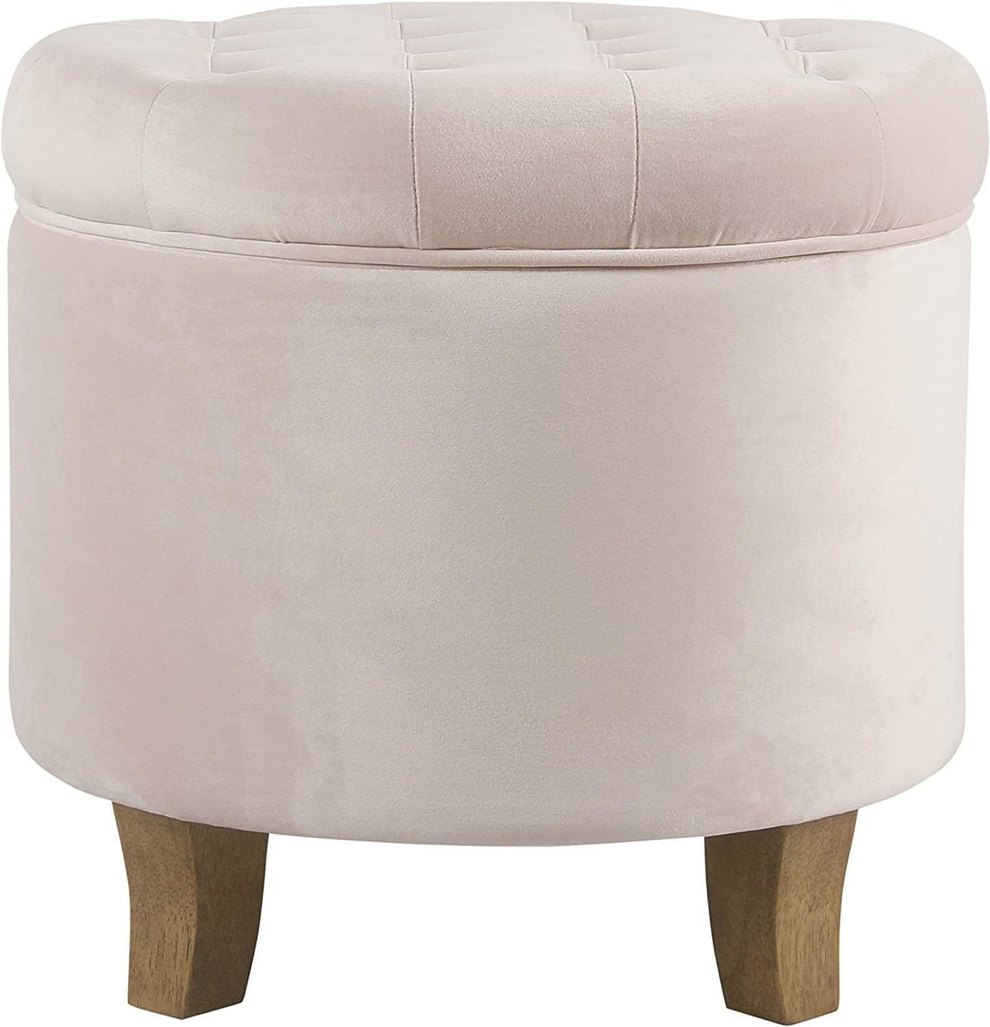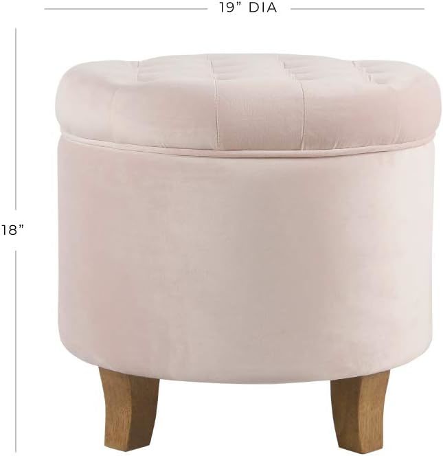 This Velvet Tufted Round Ottoman features a lift-off lid with all over button tufting for classic style. Upholstered in soft and durable velvet, this elegant round ottoman has solid wood legs in a complementary finish. Use it to hide accessories in a bedroom, to store books or magazines in a living room, or to keep controllers or remotes nearby but out of sight in a family room. Pair two storage ottomans together for added impact. The tufted ottoman is available in 10 rich velvet colors with coordinating accent items in the same hue. Easy to assemble and maintain.