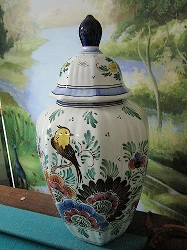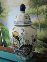 5- COVERED URN LARGE BIRDS AND FLOWERS # 247, 15" TALL SOME CRAZING