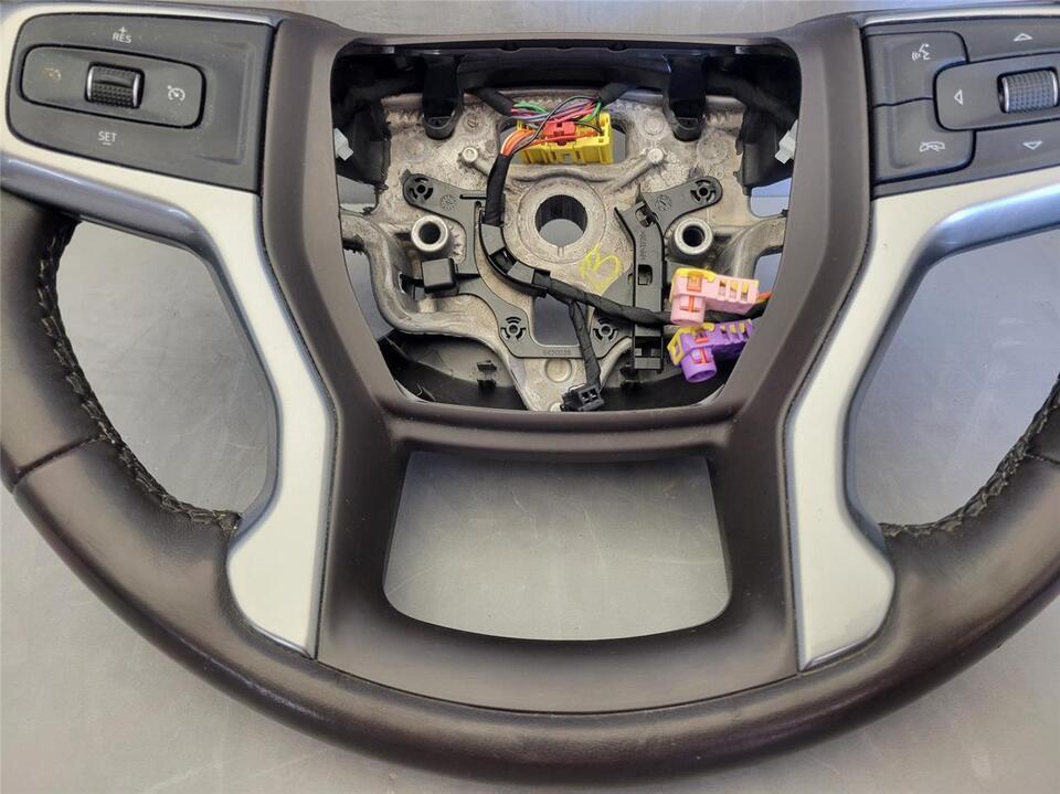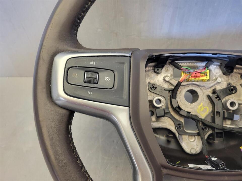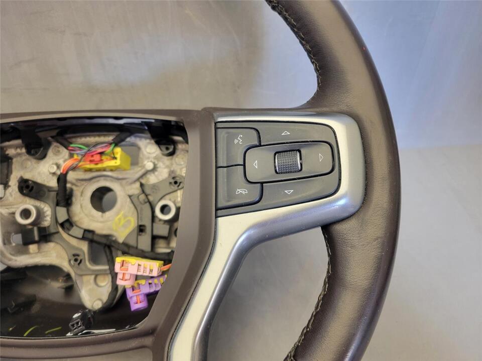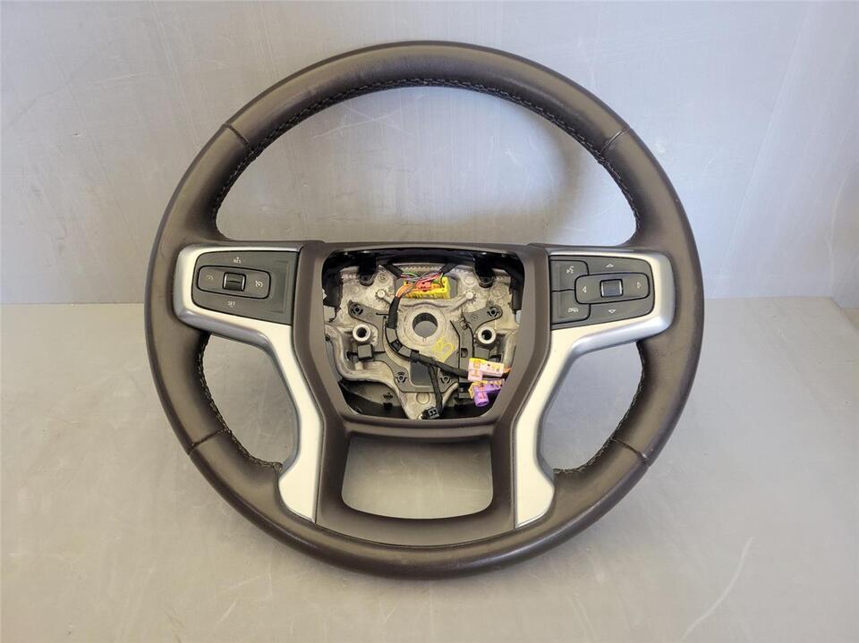 This listing is for an OEM 2019-2023 Chevrolet Silverado 1500, Tahoe, Suburban and GMC Yukon XL Brown Leather Steering Wheel. The color is called Very Dark Atmosphere. For models WITHOUT heated steering wheel
