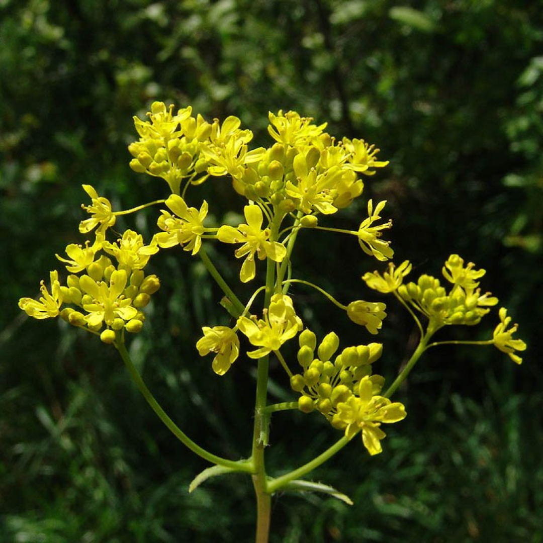 - Biennial herb featuring vibrant, blue-green leaves and small, yellow flowers