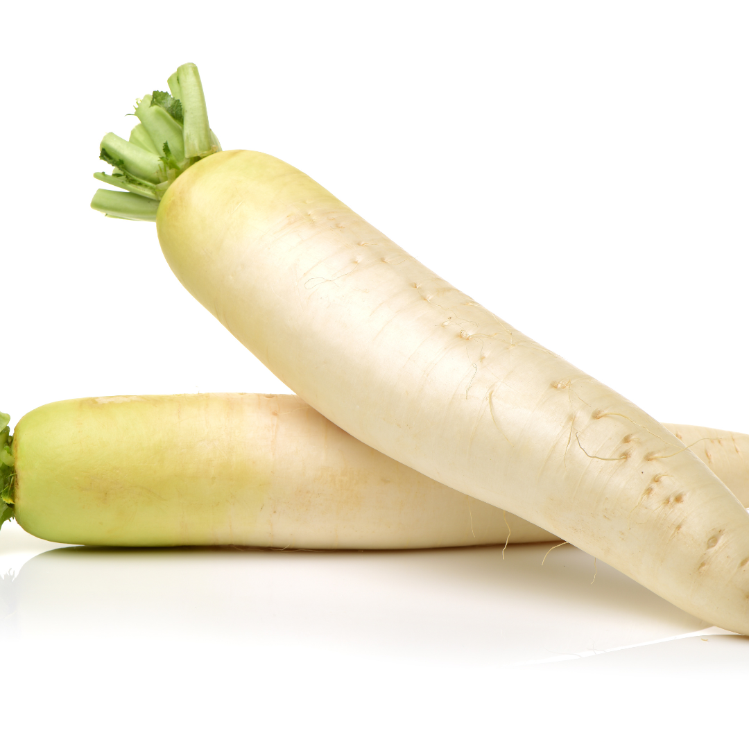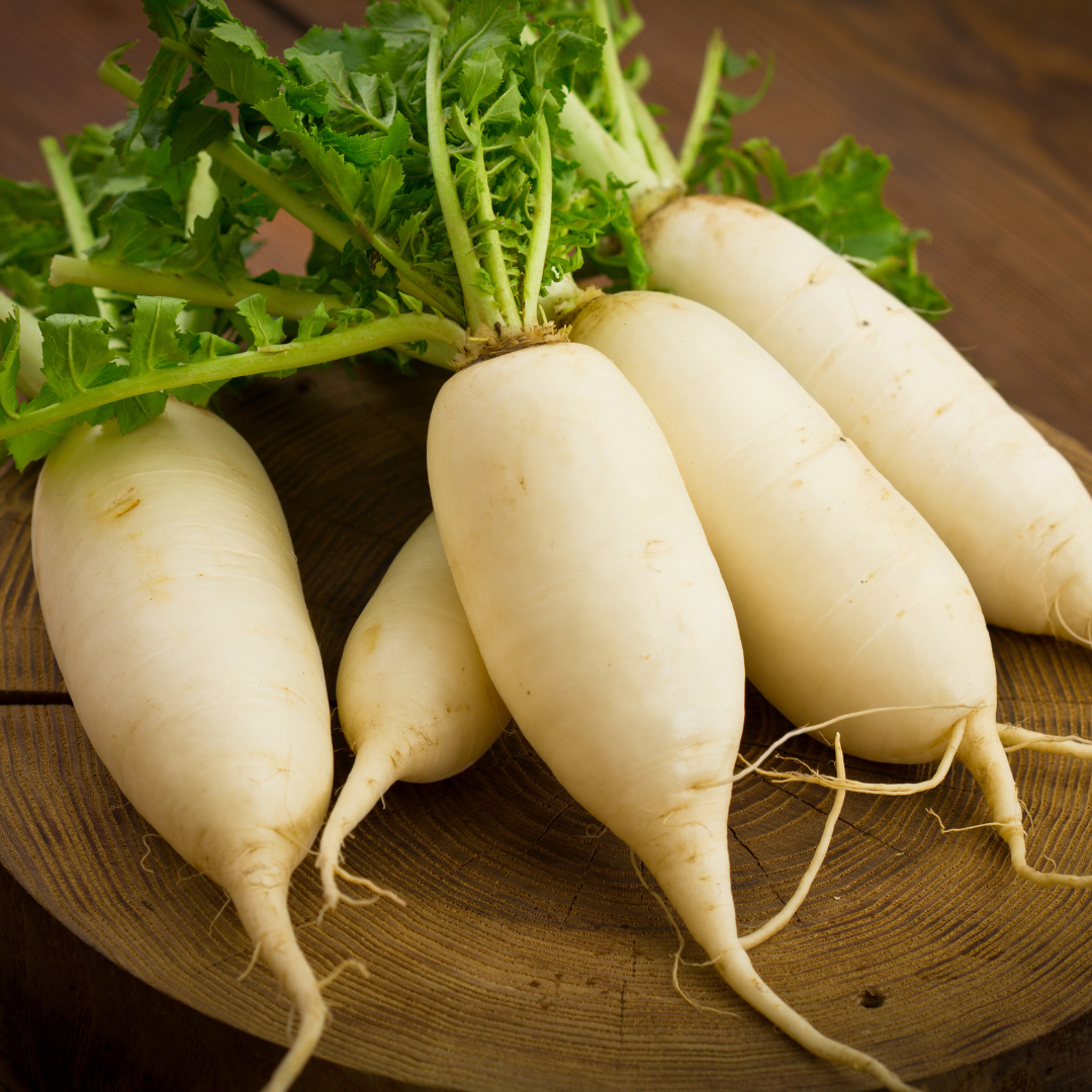 - White Icicle Radish variety featuring long, slender roots and a crunchy texture
