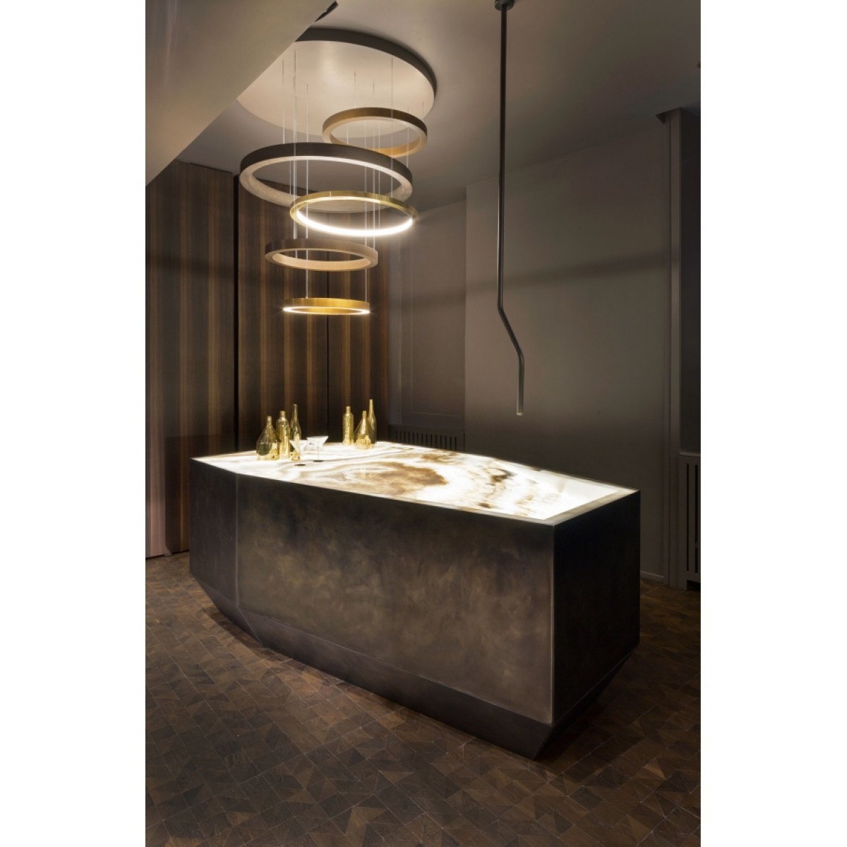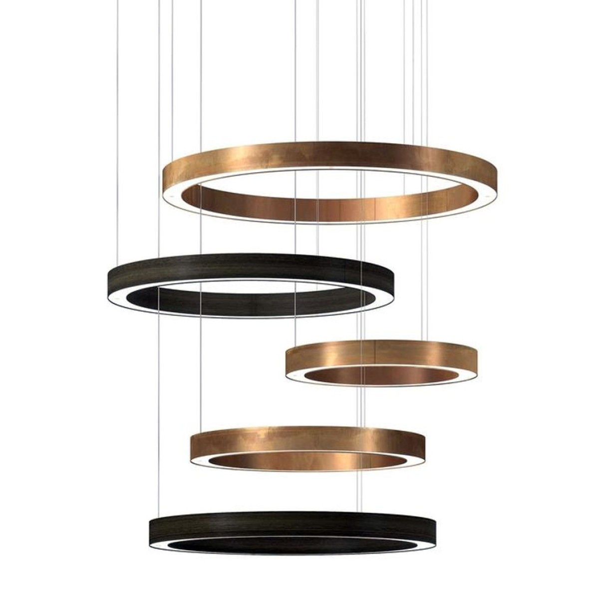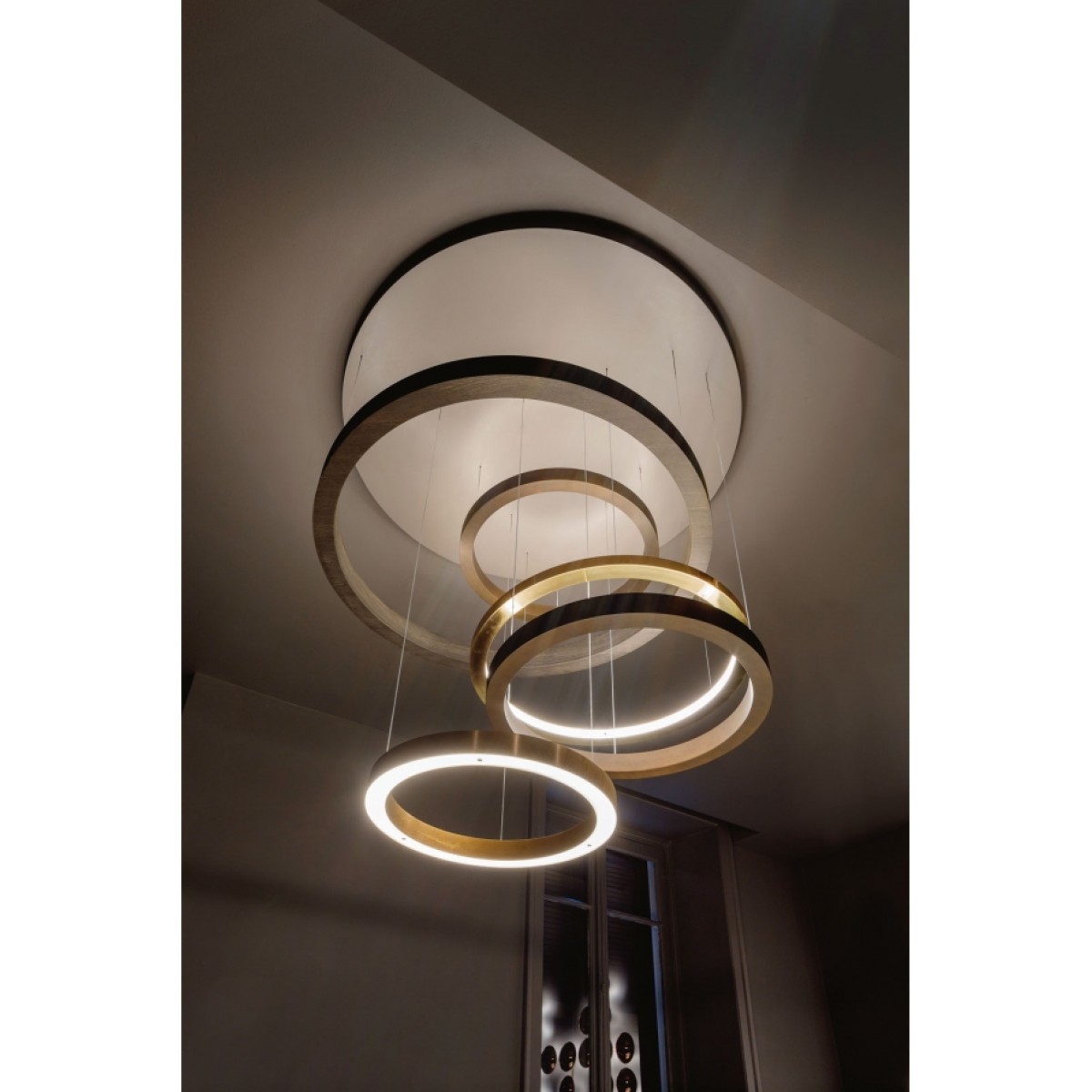 Concentric rings, in sequence or overlapping, wall-mounted or suspended, develop archetypal visual codes inspired by the beauty and purity that the circle synthesizes in its perfect symbolic form. An idea realized with important hand-crafted materials that diffuse a warm and intriguing light. To consider this design as a mere furnishing complement is to underestimate its value: The design of this light creates one-of-a-kind pieces that are cared for in every smallest detail and are thus more like a work of art. The Light Ring Multimateric suspension lamp is like a moving sculpture: the differently-sized suspended rings offer a unique visual sensation. This is not your usual suspended lamp, this is more like a work of art that will steal the spotlight in your indoor spaces. Its design is captivating, elegant, and non-conformist.