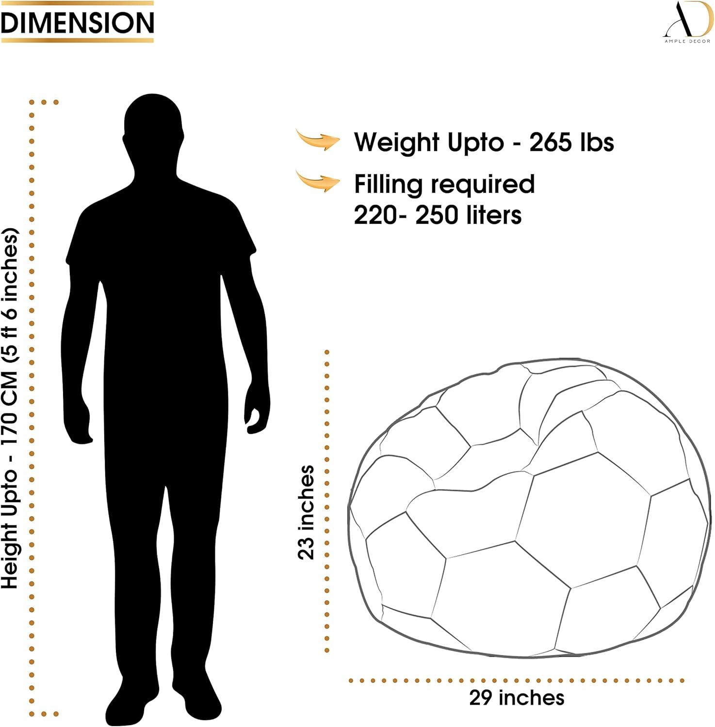 PREMIUM QUALITY MATERIAL: High-quality leatherette with double stitching for strength and durability makes an excellent material. Unlike conventional cotton, our material is light, soft, and skin-friendly. It is also stain-proof, does not fade. COMFORTABLE DESIGN: This bean bag cover is sure to establish itself as the most comfortable seat in the house. It's perfect as occasional seating for when visitors stop by, or as an accent piece in the corner of your living room, bedroom, or games room. EXCELLENT STORAGE SOLUTION: What a terrific way to store plush stuffed toys! They must be adored by your youngsters! Additionally, you may store blankets, used clothing, and toys inside the bean bag cover. If you don't have effective plastic foam, you can urge teenagers to gather old stuffed animal toys, pillows, and T-shirts to stuff inside, giving them a unique mission to fulfil that is good for the environment and lowers garbage disposal in order to grow up to be an environmentalist. BEAN COVER ONLY: This package only contains the bean bag cover; it does not come with any bean filling. The bean filling needs to be bought separately. The amount of use determines how often the bean bags need to be refilled. In this size, 1.5?1.8 kg/150?180 L can be filled. CARE INSTRUCTIONS: Wipe the surface with a dry cloth (Do not Machine Wash, Tumble Dry, Bleach or Dry Clean)