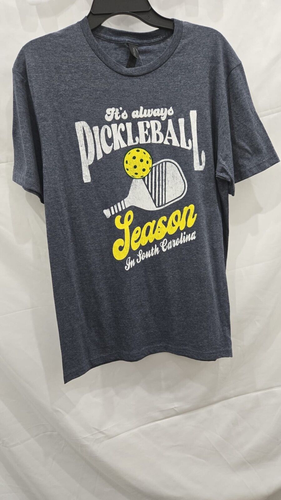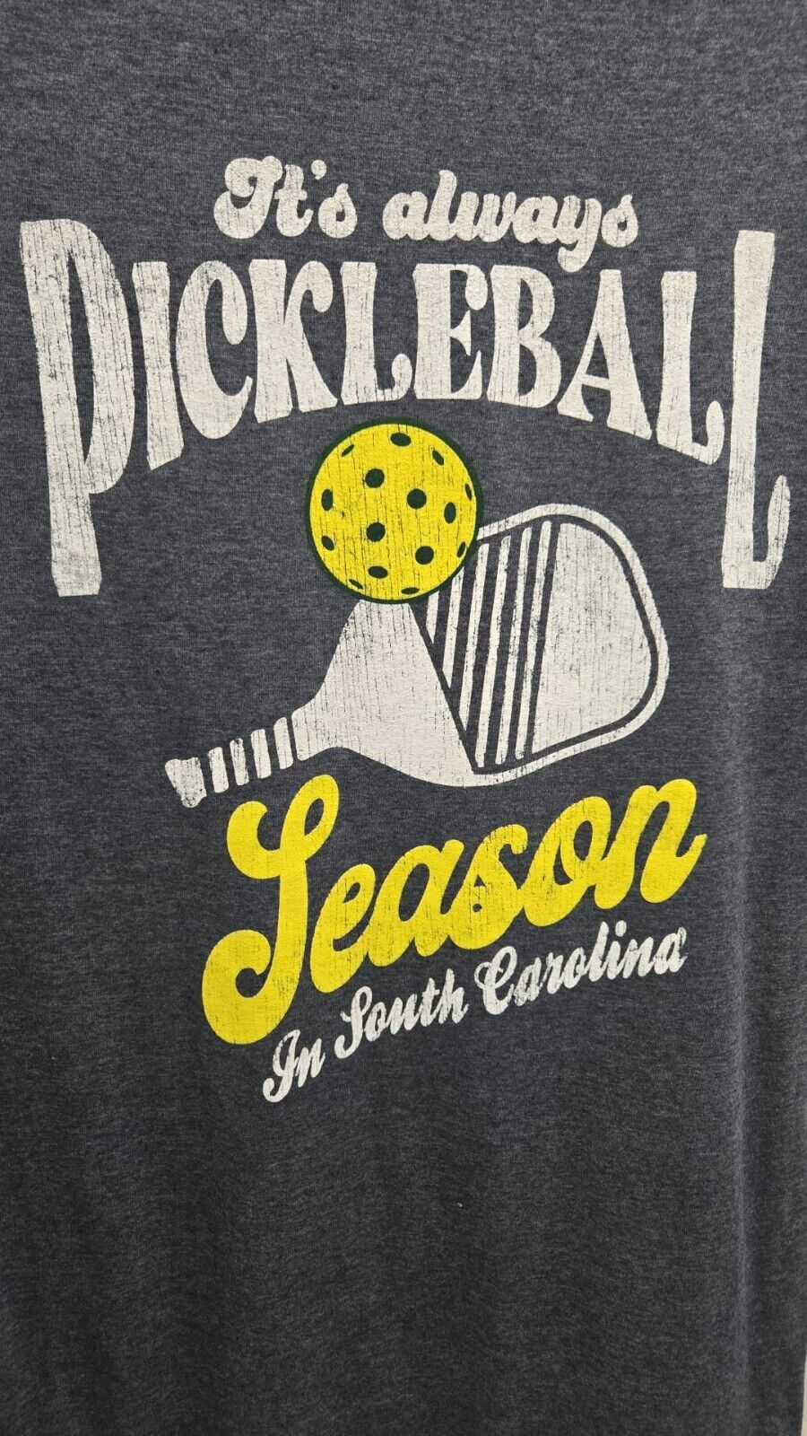 Eye-Catching Design: Features a bold graphic with "Pickleball" in a retro-inspired font, a pickleball and paddle illustration, and "Season" and "In South Carolina" in a contrasting yellow.
