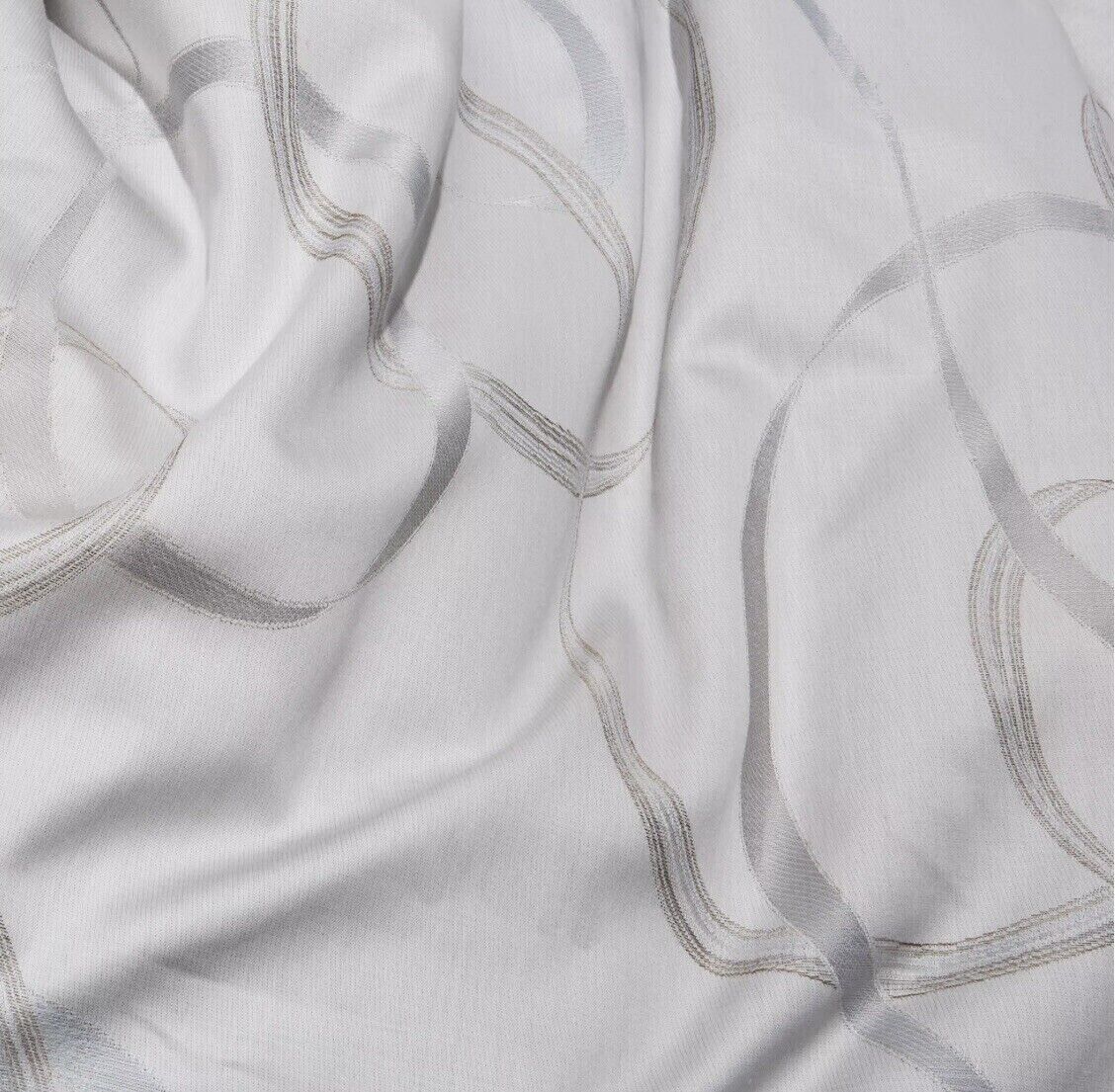 Silvered ribbons entwine on Caravino, a yarn-dyed sateen jacquard made in Italy and offered in the elegant Tin colorway