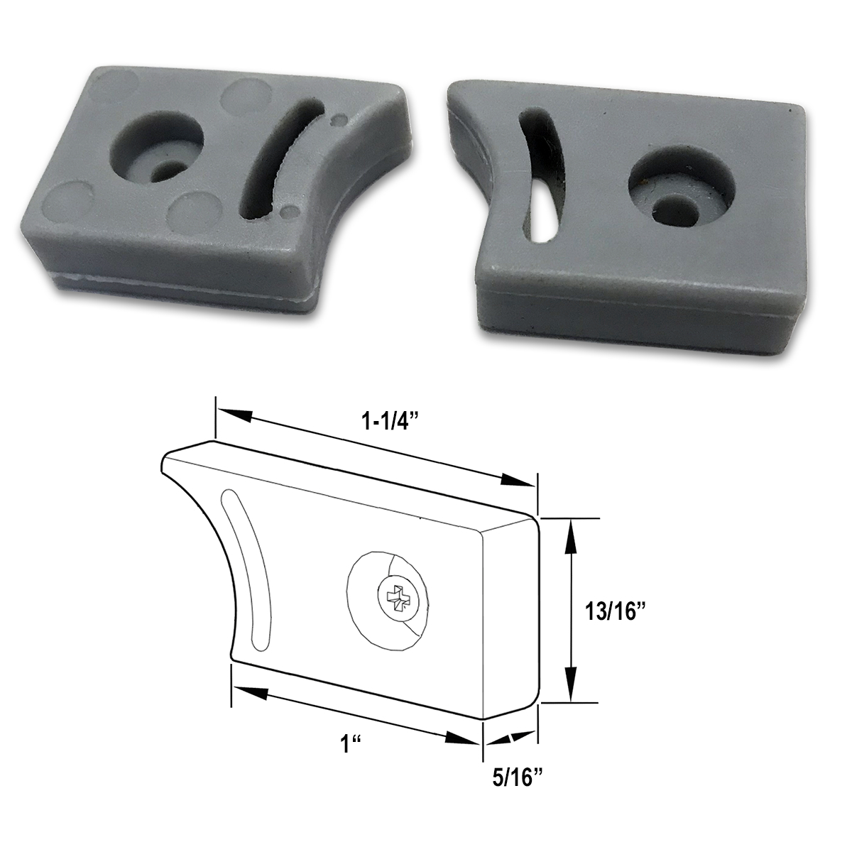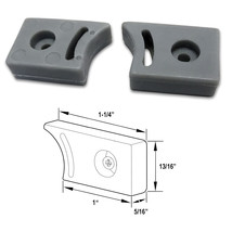 Gordon Glass top or bottom guide rail bumper stopper used on frameless sliding shower doors as a roller stopper. Prevents the glass door from hitting the door jamb. Material: Rubber Color: Gray Set Includes: One Right and One Left guide rail bumper stopper. Note: Screws are not included.