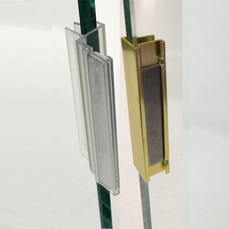 Clear Polycarbonate U-Channel with Magnet for 3/8" Glass Shower Doors and Bright Gold strike plate. Can be used for 3/8" running inline hinged shower door or fixed panel. Length: 3" Glass Thickness: 3/8" Installation Instructions: Place the rubber gasket for the strike plate over the edge of the glass on the desired area and apply the U-Channel over the gasket (this may be a tight fit). If the u-channel does not fit over the gasket, you can remove the gasket and use clear silicone to secure the u-channel. Snap clear polycarbonate u-channel with magnet onto the fixed panel or a door. Package include: Polycarbonate U-Channel with Magnet and Aluminum U-Channel with metal strike plate