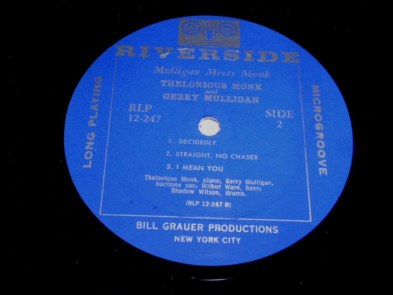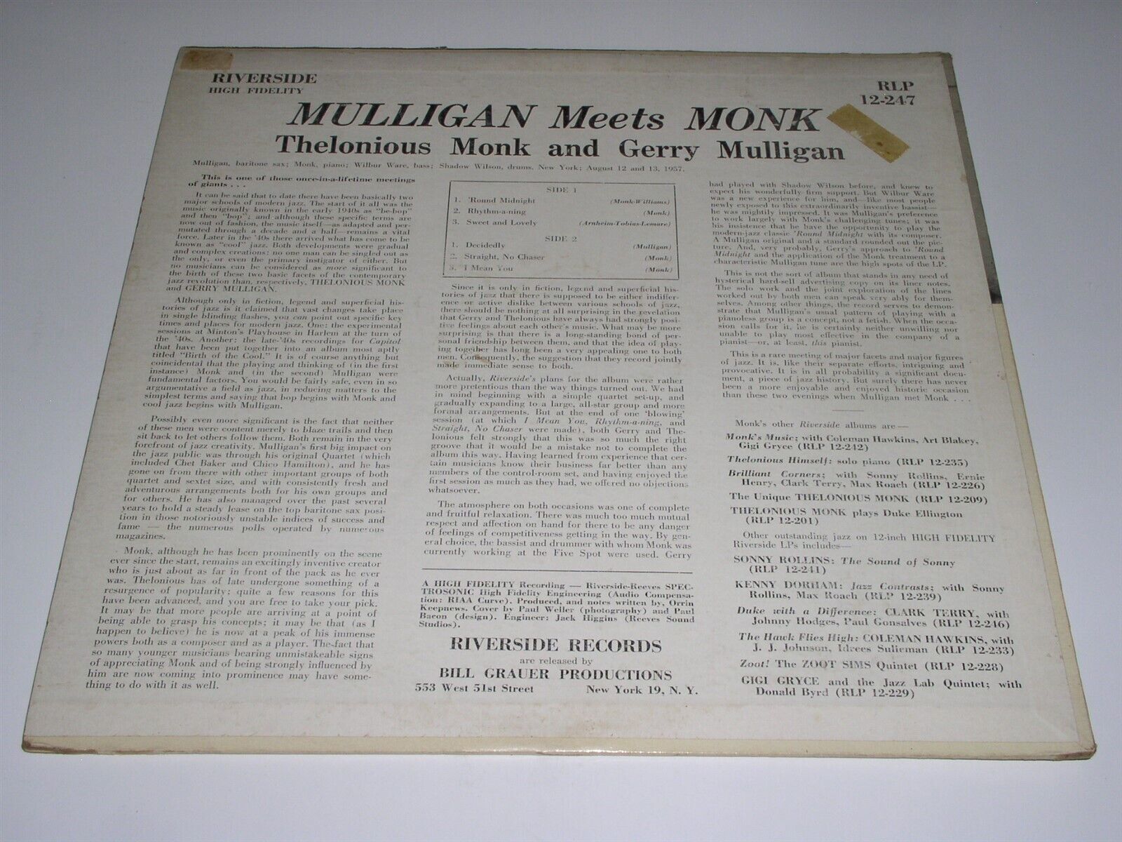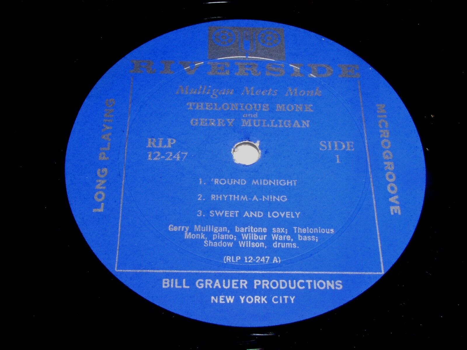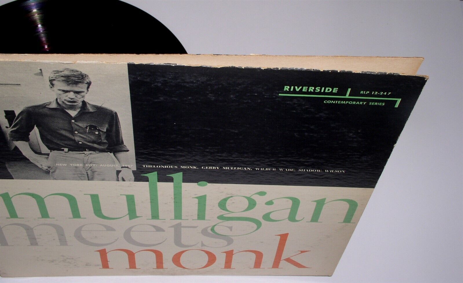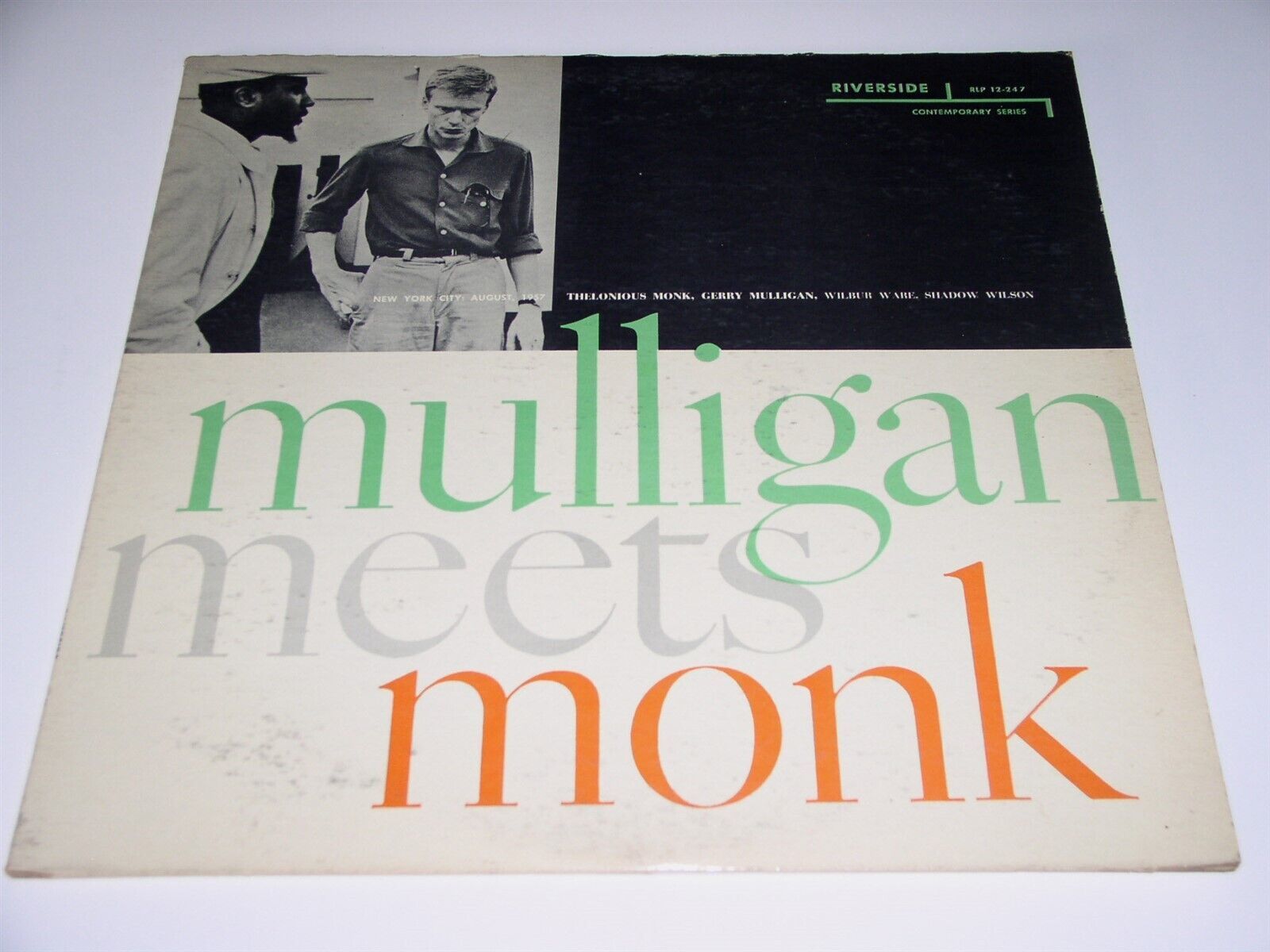 This is a vintage phonograph record album by Gerry Mulligan, entitled, "Mulligan Meets Monk". New York City August 1957. With Thelonious Monk, Gerry Mulligan, Wilbur Ware, Shadow Wilson. Record label: Riverside RLP 12-247 (Mono).