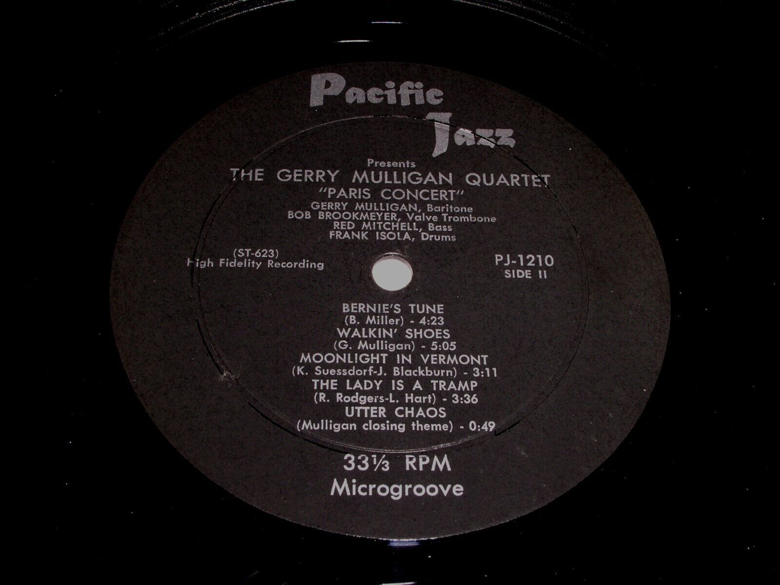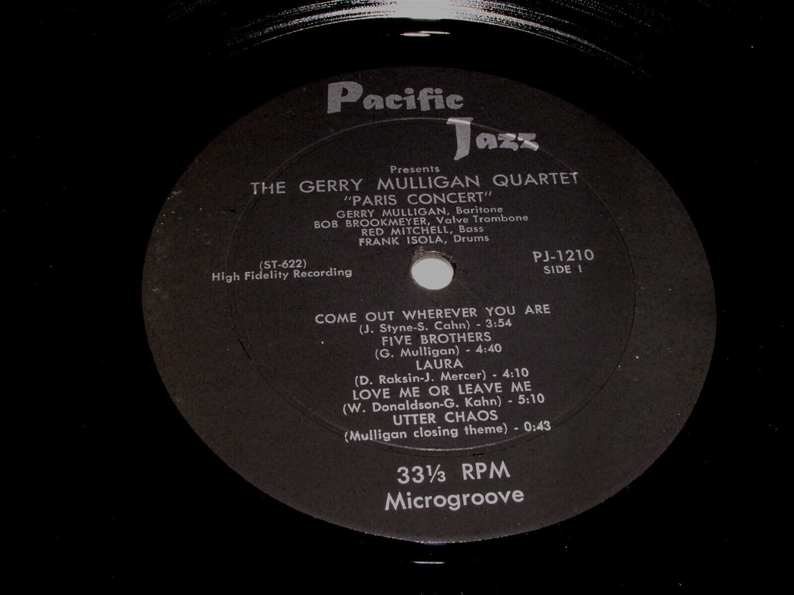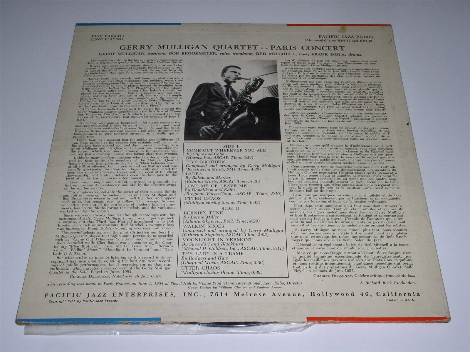 This is a vintage phonograph record album by Gerry Mulligan Quartet, entitled "Paris Concert". Gerry Mulligna, Bob Brookmeyer, Red Mitchell, Frank Isola. Record label: Pacific Jazz 1210 (Mono).