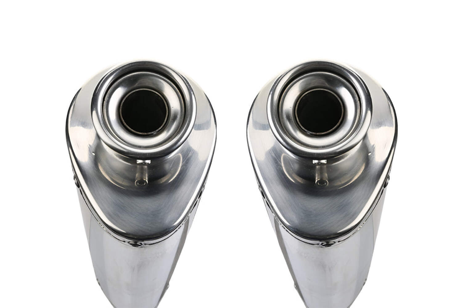 The GPR Double Slip-on Trioval exhaust system enhances the Ducati Monster 750's performance and sound. This Italian-made exhaust delivers improved power output compared to stock systems. The exhaust features a classic ovoid drop shape and polished stainless steel construction. The system adds a deeper exhaust note while maintaining legal sound limits. GPR crafts these exhausts with precision welding and premium materials. The complete kit includes mounting hardware for direct installation.