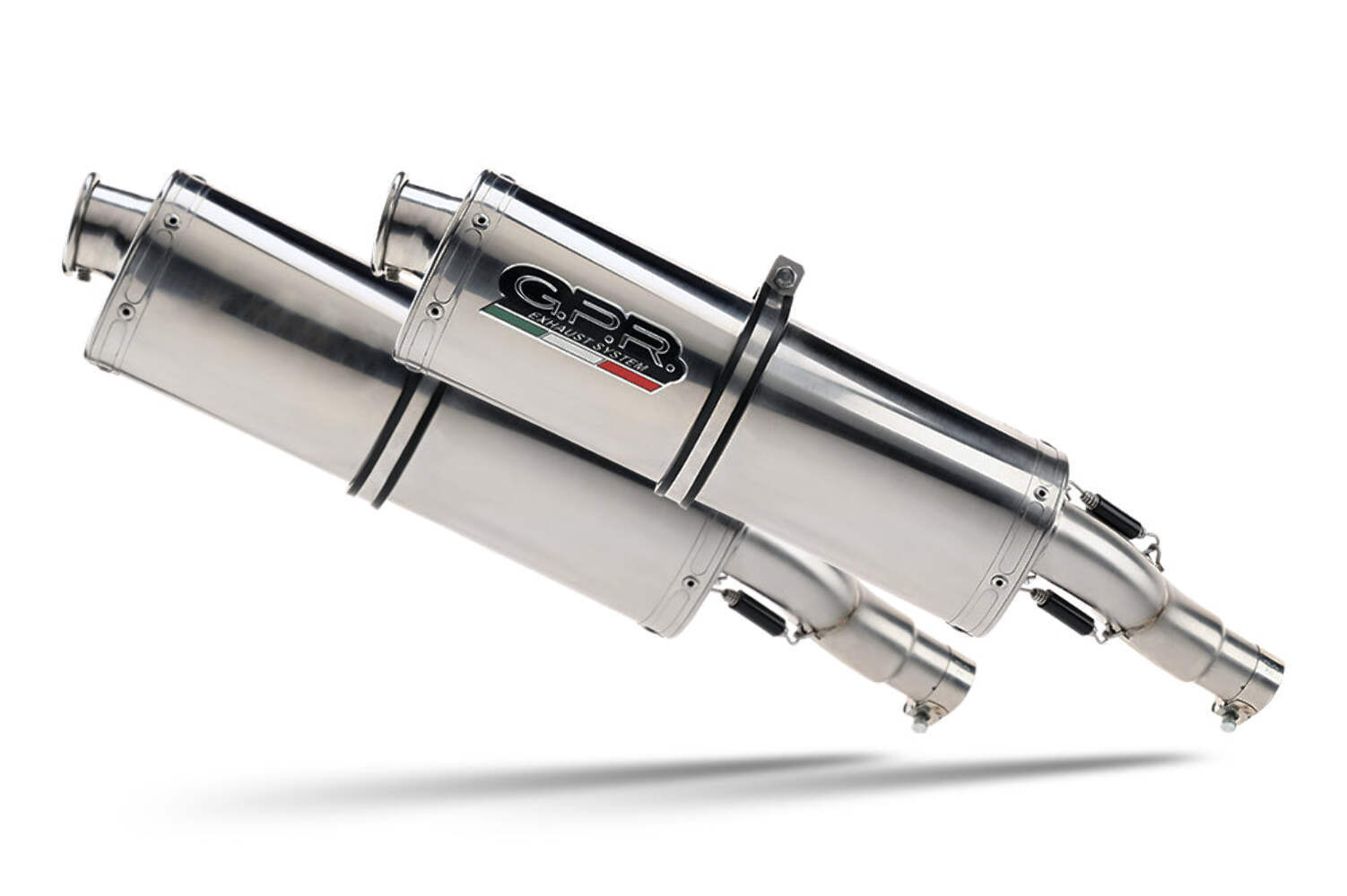 The GPR Trioval Double Slip-on exhaust enhances the Ducati Monster 900's performance and sound. This Italian-made exhaust system delivers increased power output while maintaining legal sound levels. The exhaust features a classic ovoid shape with 100mm x 130mm dimensions. The polished stainless steel construction reduces overall weight compared to stock systems. GPR includes specific link pipes and mounting hardware for direct installation without modifications. The exhaust comes with removable DB killers for sound customization.