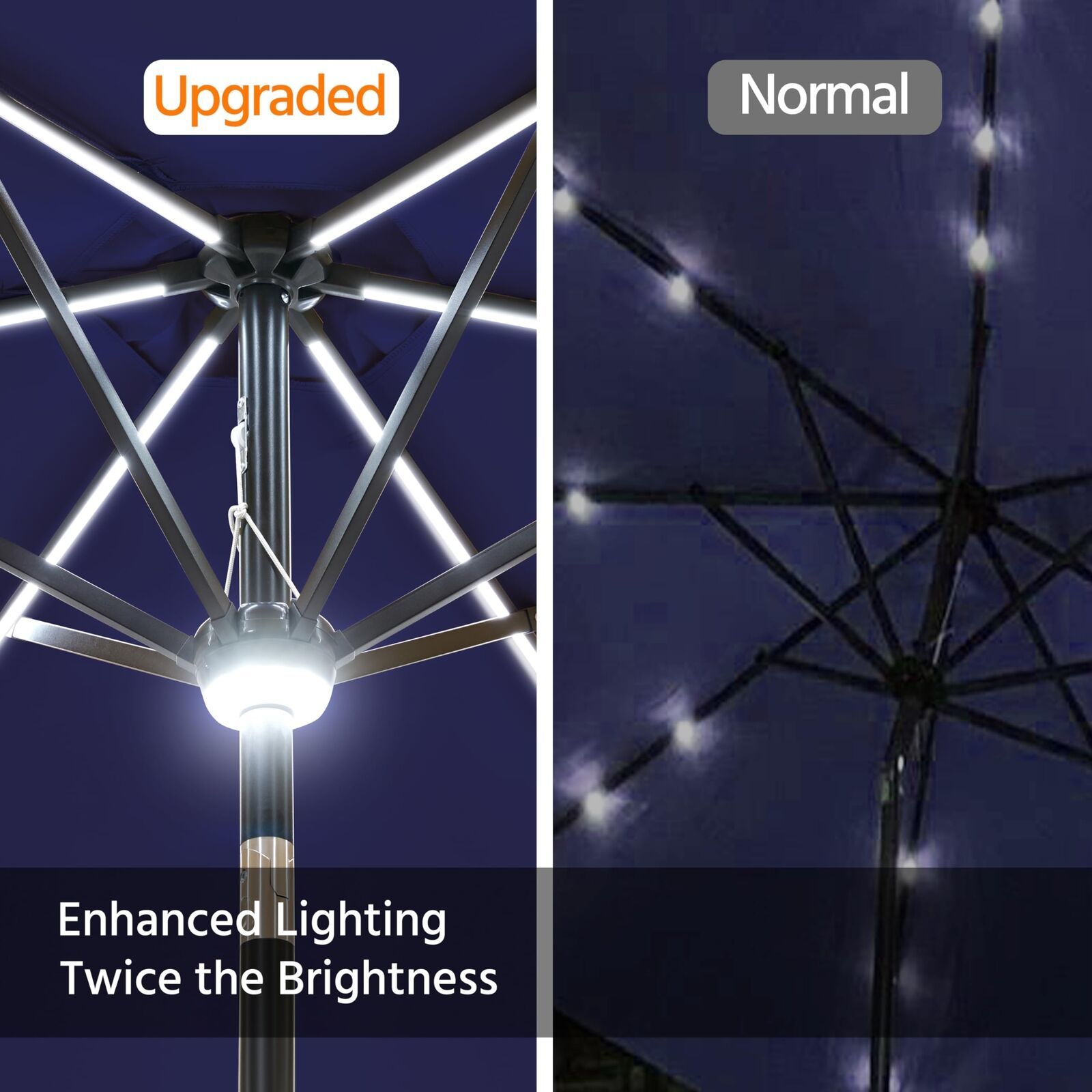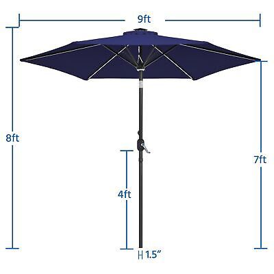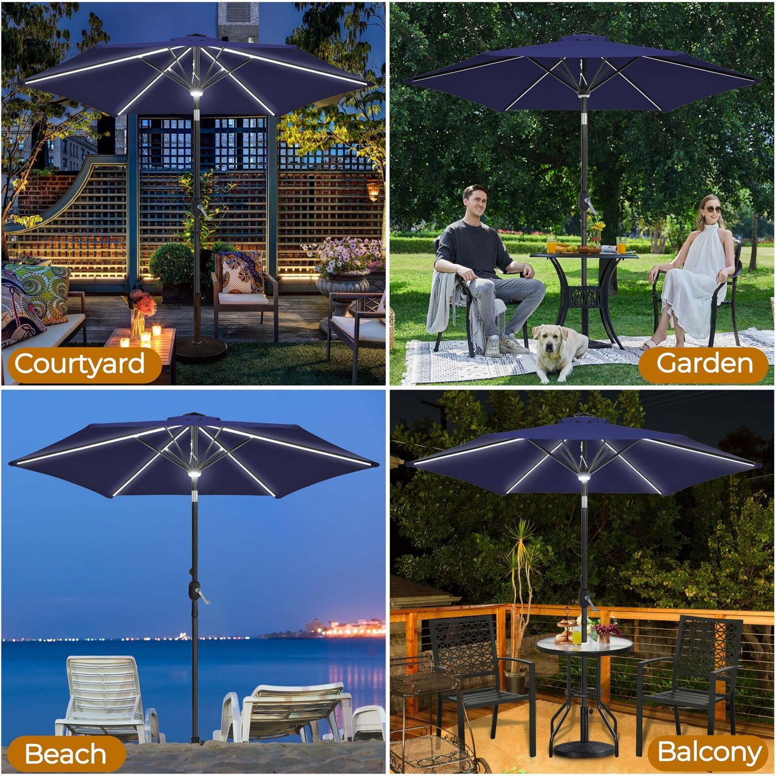 Upgraded Light Source: This canopy features upgraded LED lighting for enhanced brightness and expanded light range. Each rib is equipped with an LED strip, complemented by a central bulb. After sunset, you can continue to enjoy your outdoor time under a warm, romantic vibe Tough Materials Robust Structure: This 9ft outdoor umbrella, evenly supported by 8 ribs with a vented canopy design, this canopy is crafted from thick 180g polyester and powder-coated iron, featuring excellent wear, weather resistance, physical sunscreen, and great stability Crank Operation Vented Canopy: The crank-operated design ensures effortless opening and closing of the canopy, while the vented canopy promotes balanced airflow, reducing the risk of tipping during breezy conditions. This combination offers convenience and enhanced safety, making it ideal for everyday outdoor use Push-Button Tilt Canopy: You can easily adjust the umbrella canopy with a simple push of the button on the pole. The canopy is designed to tilt in two directions for optimal sun protection throughout the day Caution: For added stability, we recommend using a weighted base (sold separately; search B08XVVTDRJ or B08XWF943B) to secure the umbrella, or inserting it into a patio table
