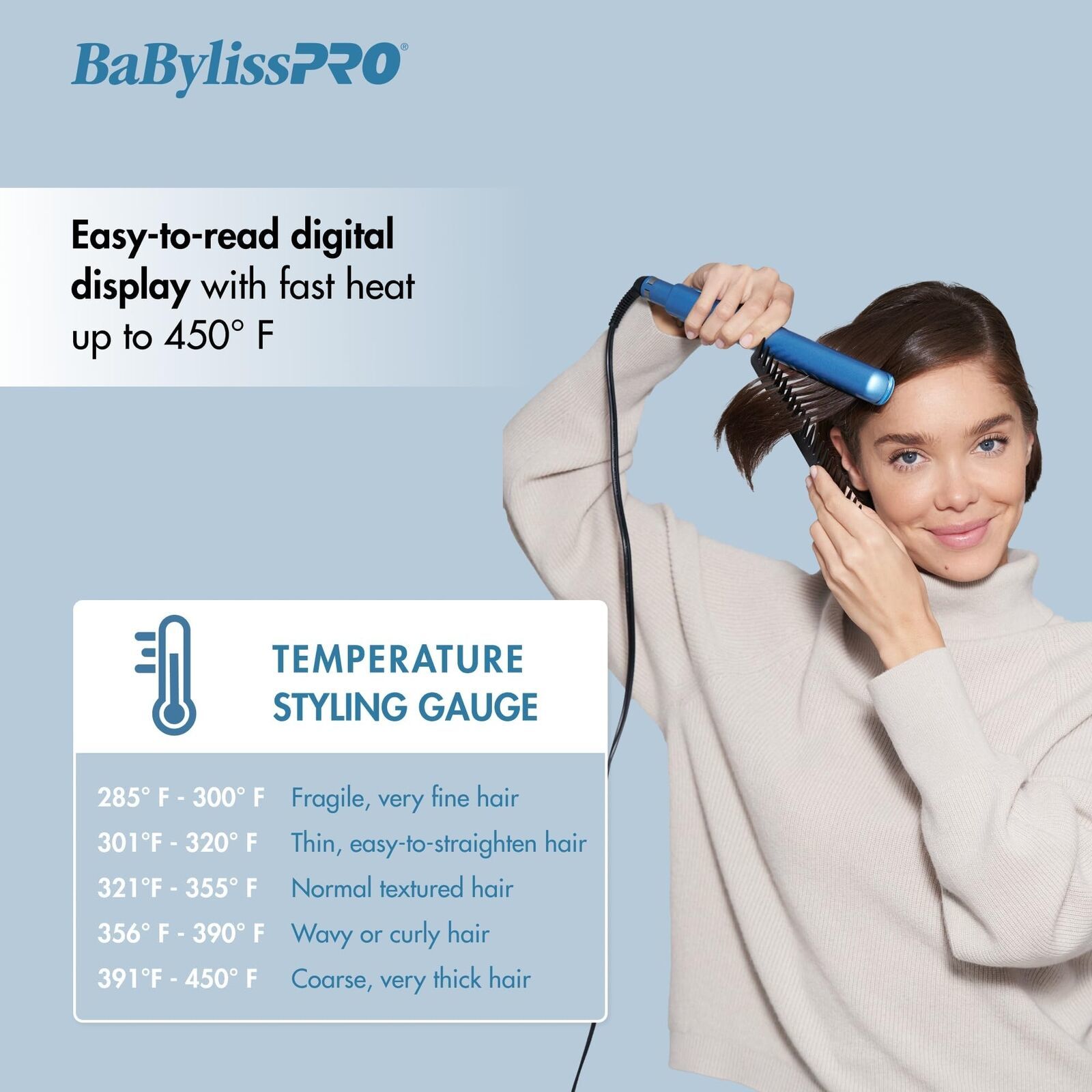 The BaBylissPRO Nano Titanium Digital Straightener features Nano Titanium technology for super shiny results. All-directional floating plates provide 100% contact with hair for fewer passes faster styling. Nano Titanium plates offer even heat distribution without hot spots negative ions leave locks smooth shiny. Use this Nano Titanium flat iron to smooth straighten hair. Can also be used to create loose, beachy waves. All-directional floating plates for 100% contact with hair; Leaves hair smooth and shiny Fewer passes and faster styling, Strong durable titanium plates last longer Digital temperature adjustment for precise control, View temperature at a glance Instant heat up to 450 DegreeF Memory function saves preferred heat settings