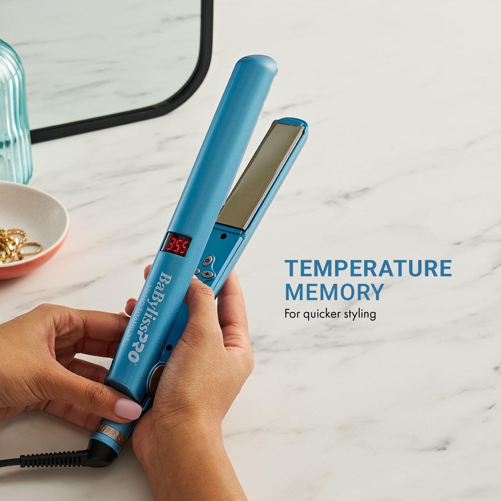 One touch. Total control. Designed for maximum comfort and precision, the BaBylissPRO Nano Titanium 1" Digital Memory Flat Iron features a timesaving memory function to store frequently used heat settings for styling convenience. Digital temperature adjustment offers precise control, and temps reach 450F in seconds. Nano Titanium advanced technology produces super shiny, silky results, and the all-directional floating plates provide 100% contact with hair for fewer passes and faster styling. One pass and done. Ultra-smooth titanium plates conduct ultra-high heat and resist corrosion.