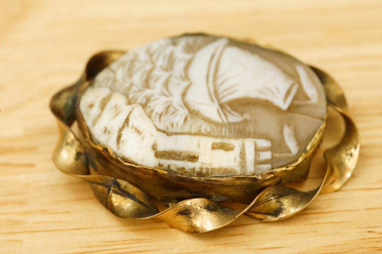 Vintage Estate Jewelry Gold Filled Brass Shell Cameo Carved Brooch Ship Castle