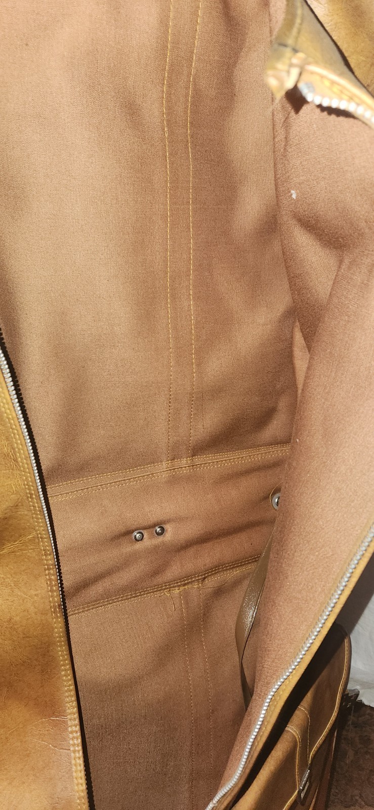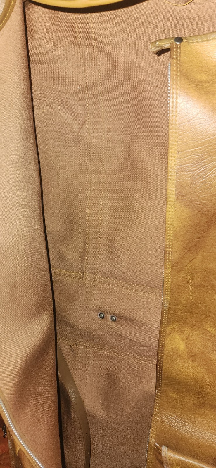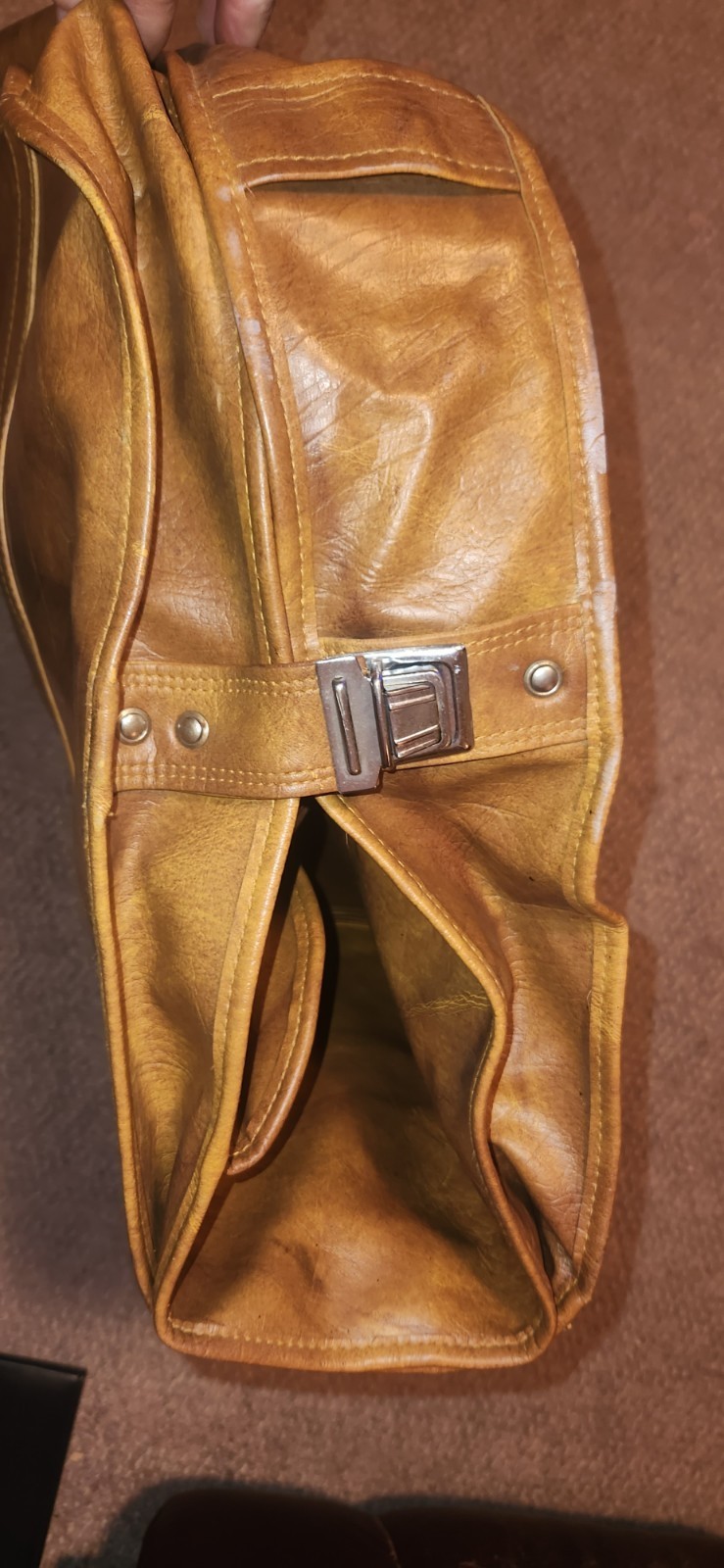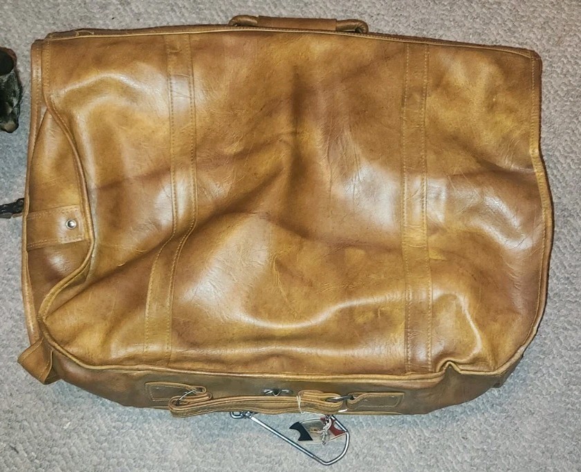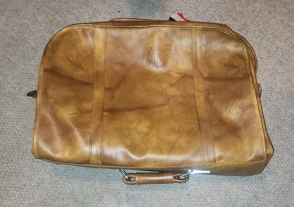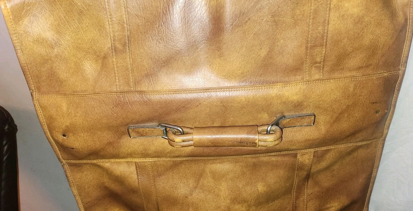 Neat vintage travel suit folding case. American Tourister. Brown leather look. Not sure if it is real leather. Missing one push button on the pocket and one on the side. Has some cosmetic issues as well. Selling as found.