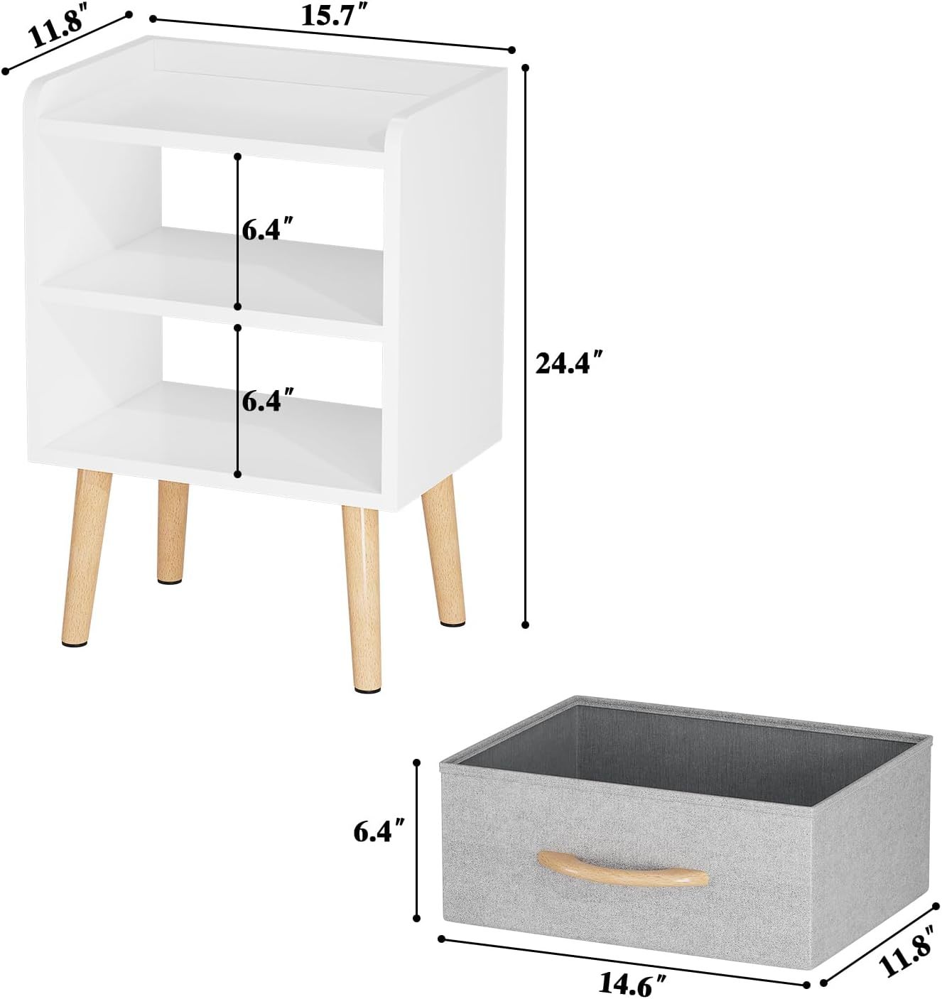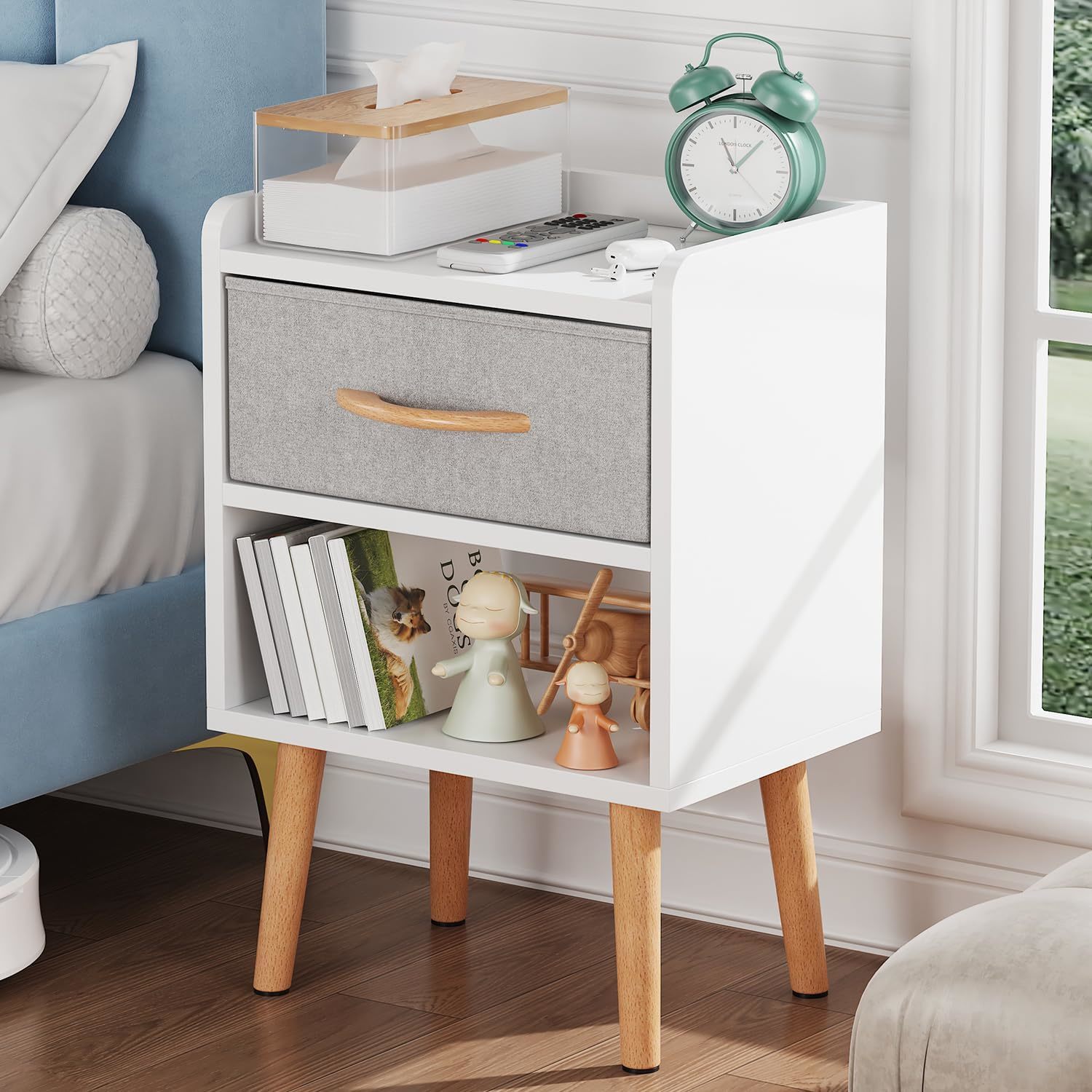 ?Sturdy and Durable?Crafted from high-quality MDF boards with scratch-proof surfaces, four legs made from solid beech wood are stably placed in a splayed shape to prevent wobbling. Fabric drawer combine MDF board with breathable fabric. This nightstand features with smooth surface, elegant look, ample storage space and durable performance. ?Spacious Storage Space?For extra convenient storage, the bedside table comes with a removable fabric drawer to tuck away books, diaries, or private essentials. The open shelf and wide top are perfect for displaying a lamp, clock, potted plant or photo frame to offer warmth and personalized decoration. ?Multipurpose?Size 15.7"L x 11.8"W x 24.4"H (40 x 30 x 62 cm), the height matches most of beds, sofa and chair makes it ideal to use as a nightstand in bedroom, as an end side table in living room, or as a toy storage in nursery. ?Minimalist and Practical?The fashion and simple design match all home decoration style, the bottom anti-slip rubber pads can prevent the floor from scratches and reduce noises when being moved, edge protection design to prevent objects from falling, the open back won't block wall socket. ?Easy to Assemble?The minimalist bedside table is very easy to assemble, all accessories and instruction are included, it will take you about 10 minutes to finish the set up easily.