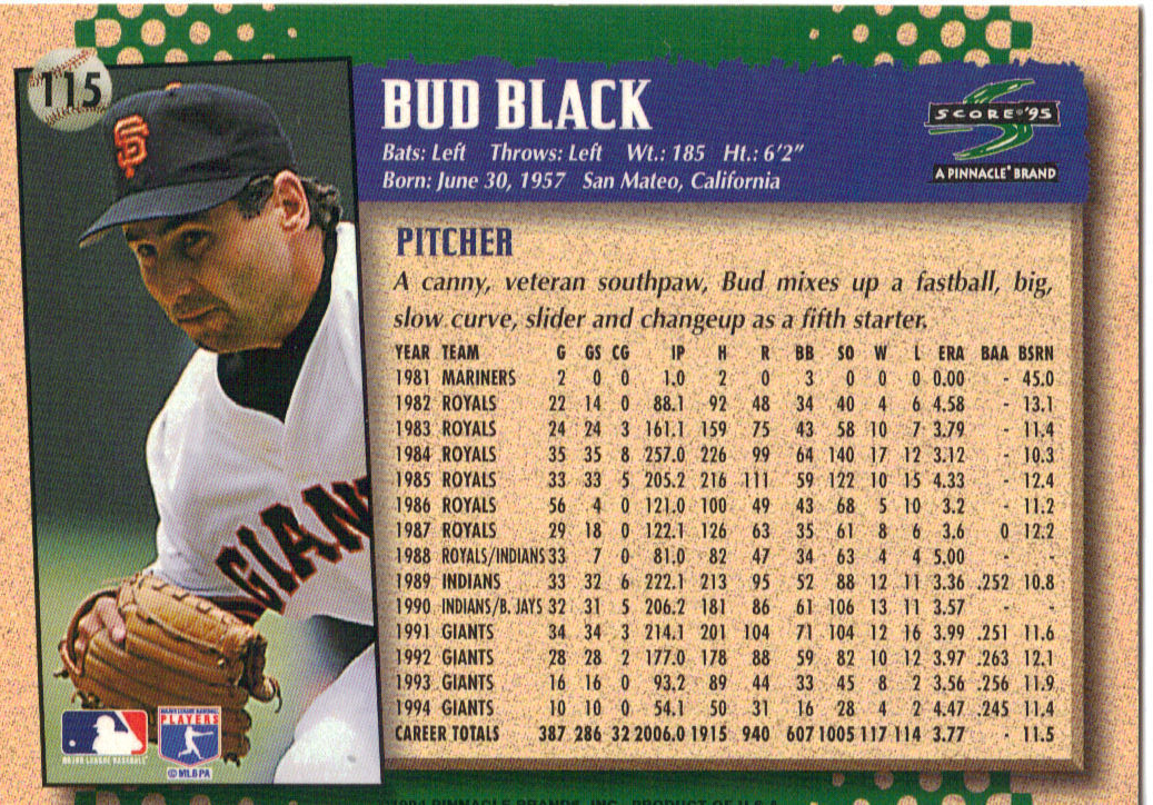 1995 Score Bud Black #115 San Francisco Giants Baseball Card