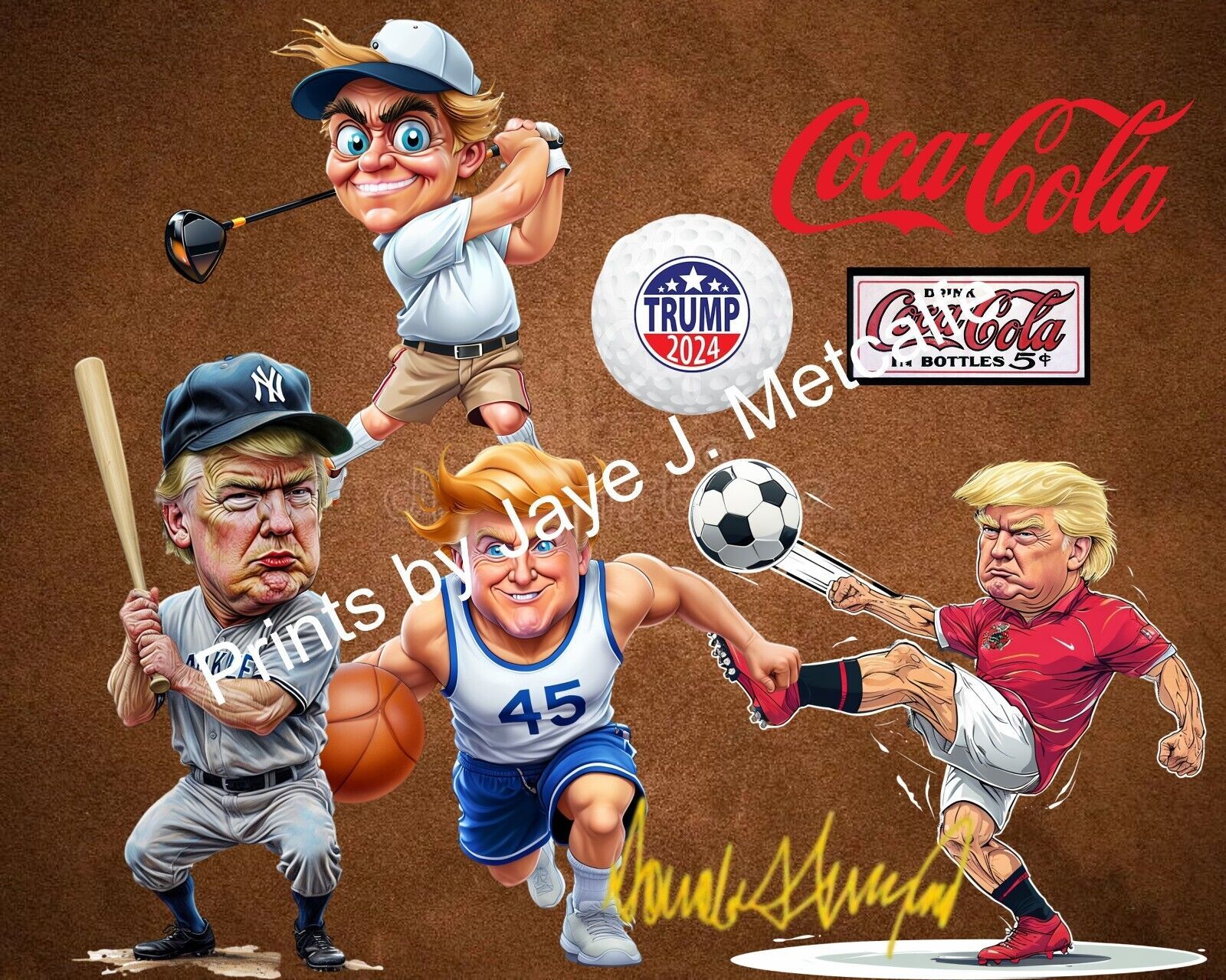 Capture a slice of Americana with the Donald Trump Coca-Cola Sports 8x10 print, a vintage homage to the iconic brand's sports-themed advertising campaigns of the 1960s. This original piece, signed by the artist J Metcalfe, is a must-have for collectors and enthusiasts alike, celebrating the rich history of Coca-Cola's marketing legacy.