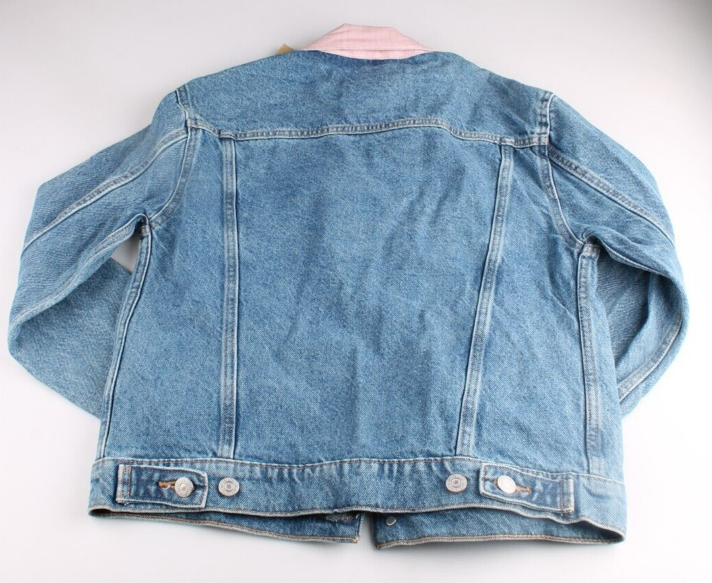 The Levi's Strauss Woman's XS Ex-boyfriend Trucker Denim Jacket in light blue denim with a pink collared design.