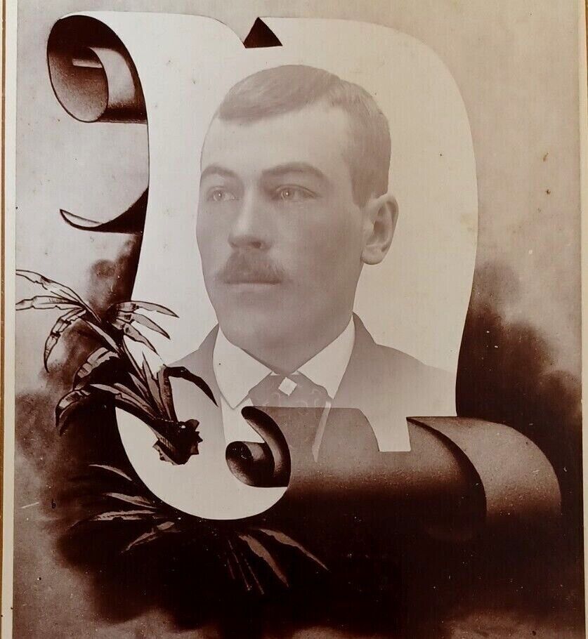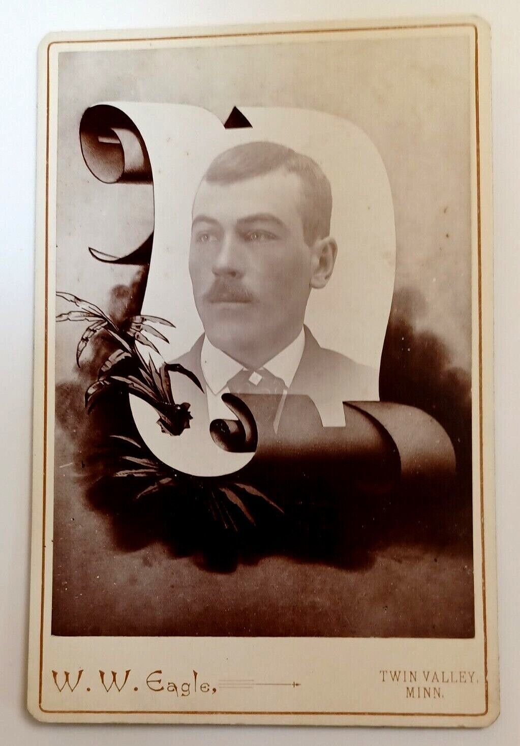 Cabinet Card Photo Memorial Scroll Handsome Young Man w Mustache Twin Valley MN