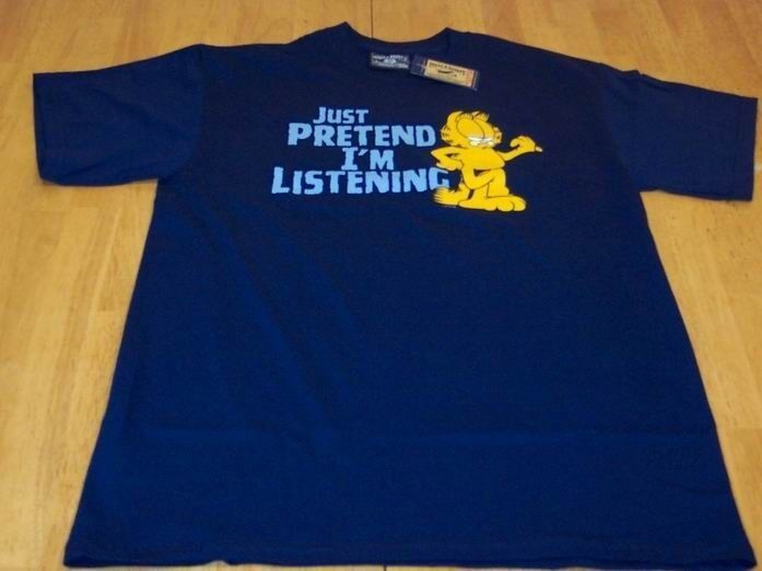 This is a GARFIELD Just Pretend I'm Listening T-shirt. It is a size MEDIUM, and it is NEW with the tag. It is 20 inches from armpit to armpit and 29 1/2 inches in length. Combine auctions to save on shipping. AD