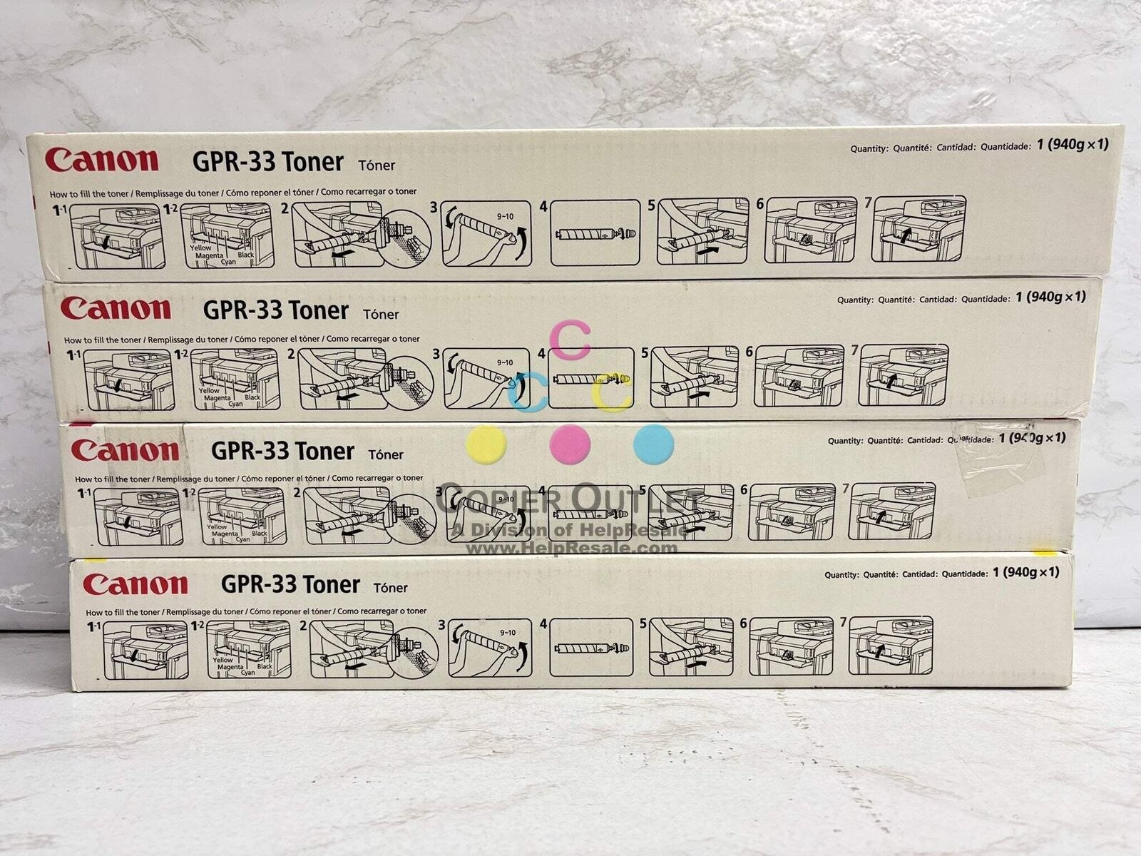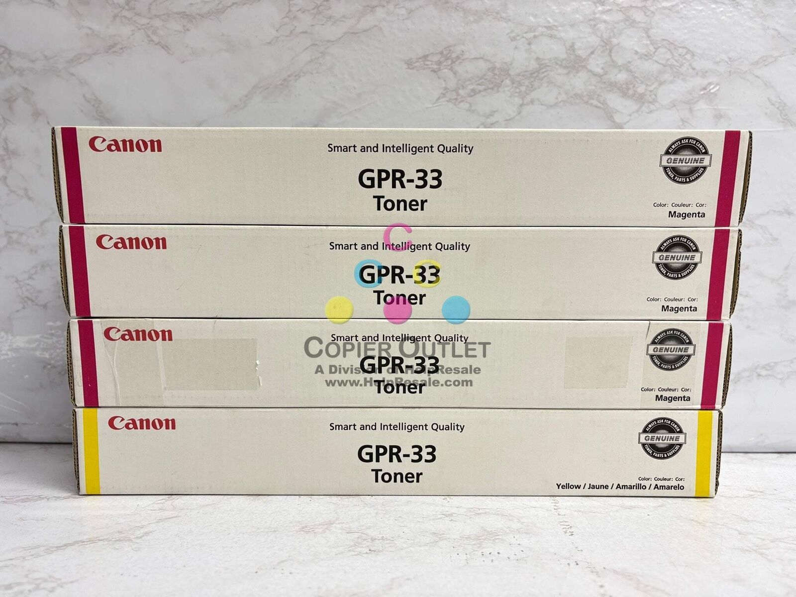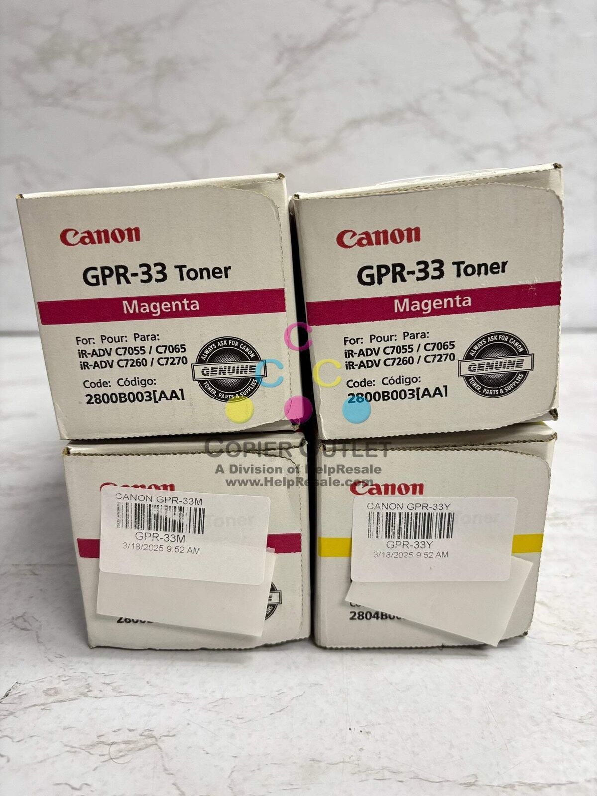 4 New Genuine Canon GPR-33 Magenta and Yellow Toner Cartridges GPR-33M - 2800B003AA - (x3) GPR-33Y - 2804B003AA - (x1) New! For Used in: imageRunner ADVANCE C7055, C7055, C7260, C7270 Same Day Shipping (For faster shipping service, please contact us.) Listed by: Briannah (Sales Team) ?You cannot climb the ladder of success with your hands in your pockets.?? Zig Ziglar (A positive moment brought to you by Help Resale) Copier Outlet (A Division of Help Resale) Copier Outlet was established in 1993. We buy and sell both domestically and internationally and have wide assortment of copiers, consumable and accessories of all popular brands. All of our copiers are in house and available for your inspection. They all have been tested and rated for functions, cosmetics and overall appearance. Our consumable and accessories selections include toners, imaging units, developers and copier parts such as fax board, fixing unit, fuser unit, roller, cleaning brush, drum blades and etc. For more detailed information on our copiers, consumables and accessories, please feel free to give us a call. We are more than happy to assist you with the pricing and guide you to find the copiers, consumable and accessories you wish to buy. Best Regards, Copier Outlet Sales Team Monday - Friday: 9:00 am to 5:00 pm (PST) Copier Outlet Promo Video - YouTube Video will open in a new windowUsing the App? Paste link into a browser window: [isdntekvideo] All product and company names are trademarks TM or registered trademarks of their respective holders. Use of them does not imply any affiliation with or endorsement by them.