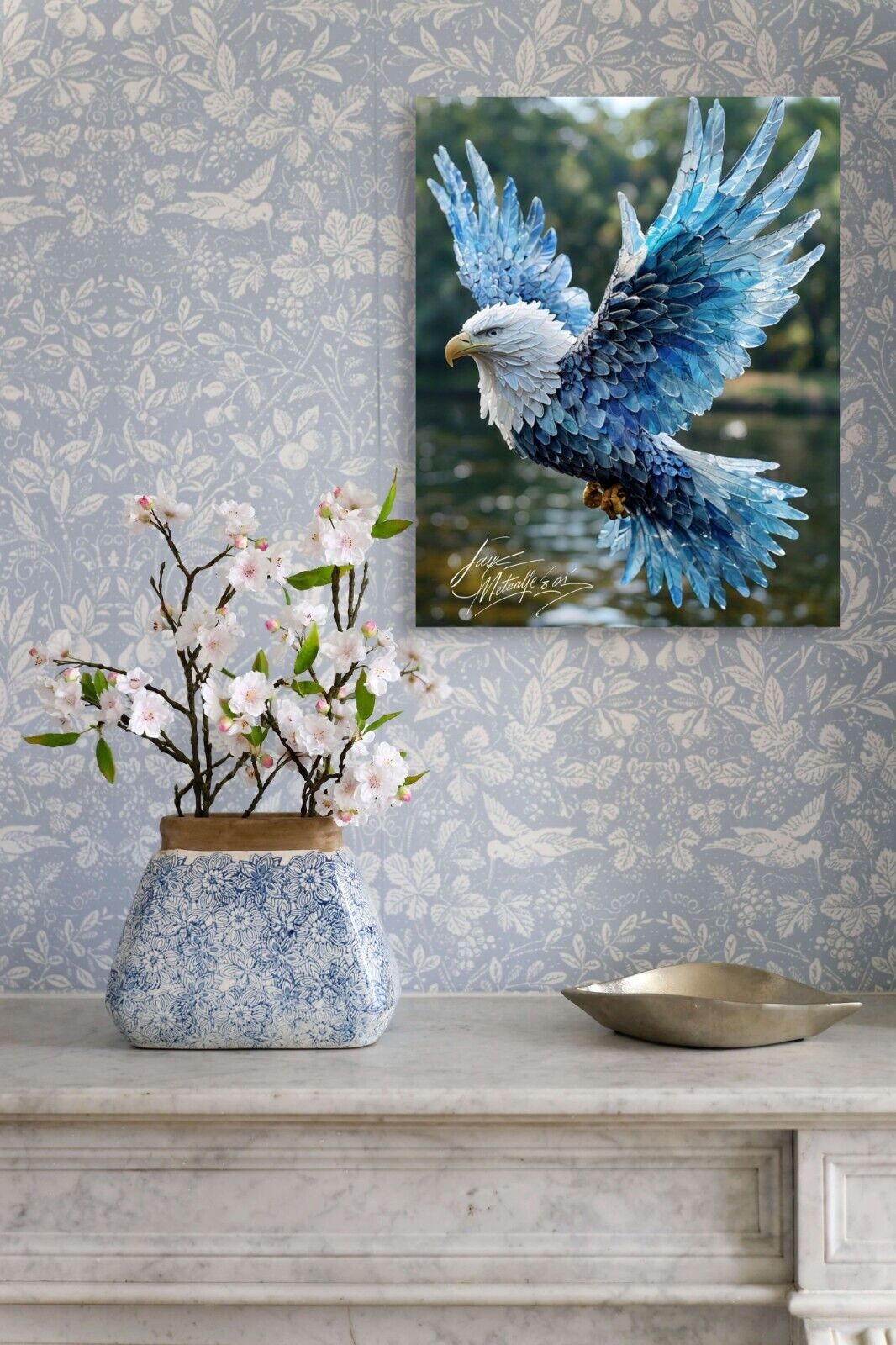 Elevate your space with the serene beauty of this Flying Blue and White Bald Eagle Wall Art. The 16x20 canvas portrays the majestic bird in a style that captures the essence of romanticism, rendered in soft whites that offer a clean and versatile look, perfect for any room in your home.