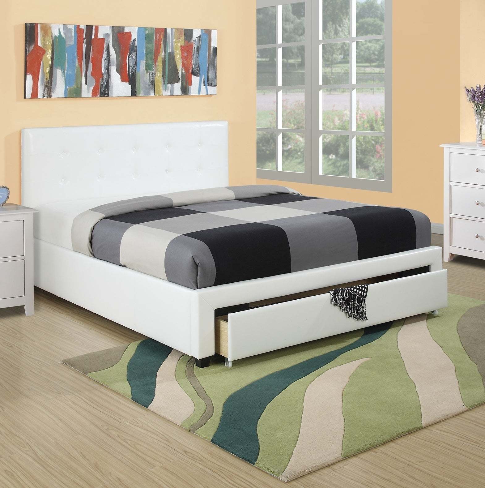 Wisk away your evening with this bedframe that features a a faux leather upholstered bedframe with button tufting on the headboard and an underdrawer for extra storage. Compliment your bedroom space decor with a matching nightstand, mirror, and dresser. Available in black, white or beige. Bedframe available in or full size.