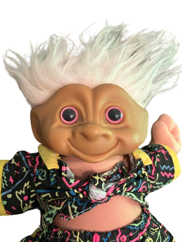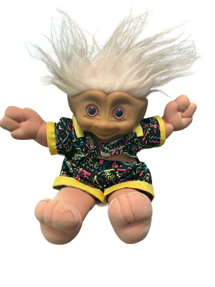 Excellent condition. This is a unique and rare vintage Treasure Troll doll from 1991. The doll has white straight hair and beautiful pink eyes that make it stand out. It comes with a soft body and is gender-neutral, making it perfect for collectors of all ages. The doll is 16 inches long and 14 inches tall, with a medium complexion.