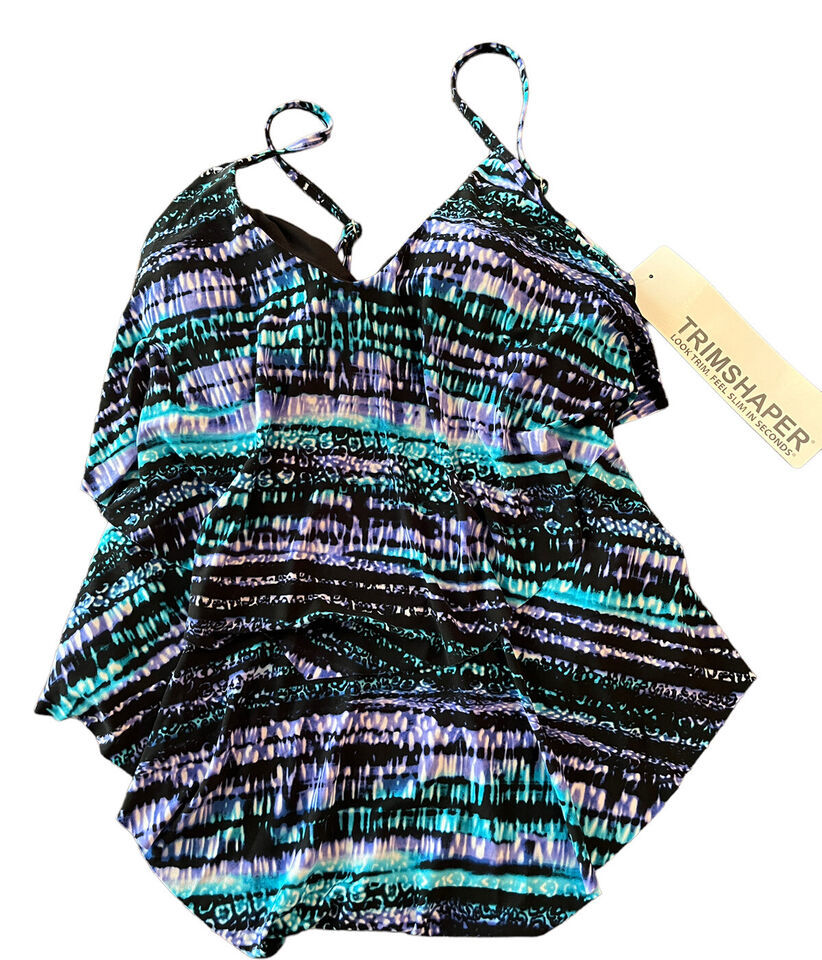 NWT Trimshaper Womens Tankini Bathing Suit Tap Tie Dye Ruffled Womens Sz 8