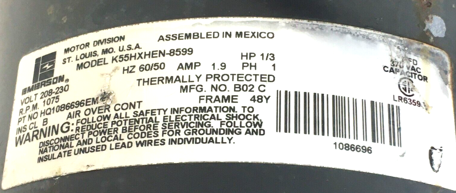 This is Emerson K55HXHEN-8599 Condenser Motor ICP Heil HQ1086696EM 1/3 HP 208/230 V 1075 RPM used part.
