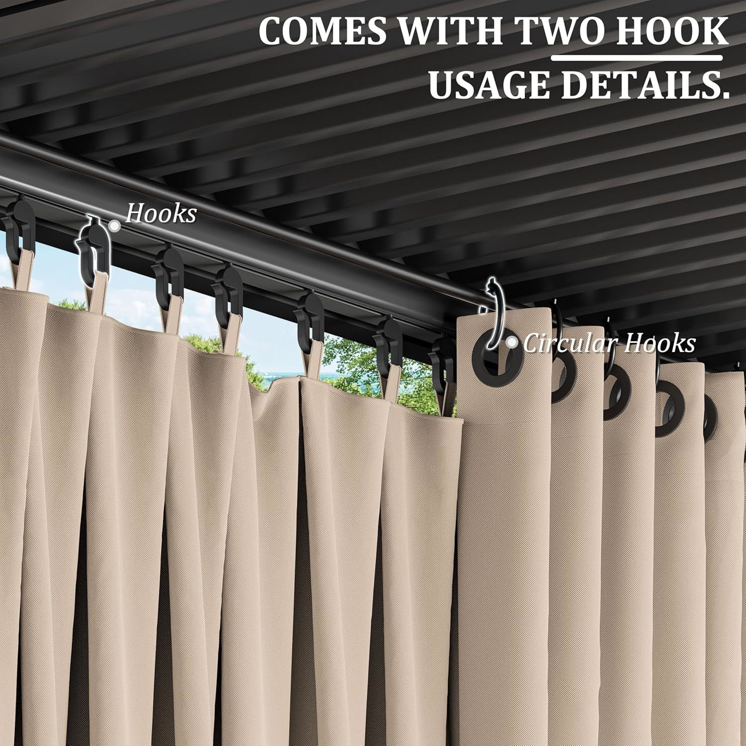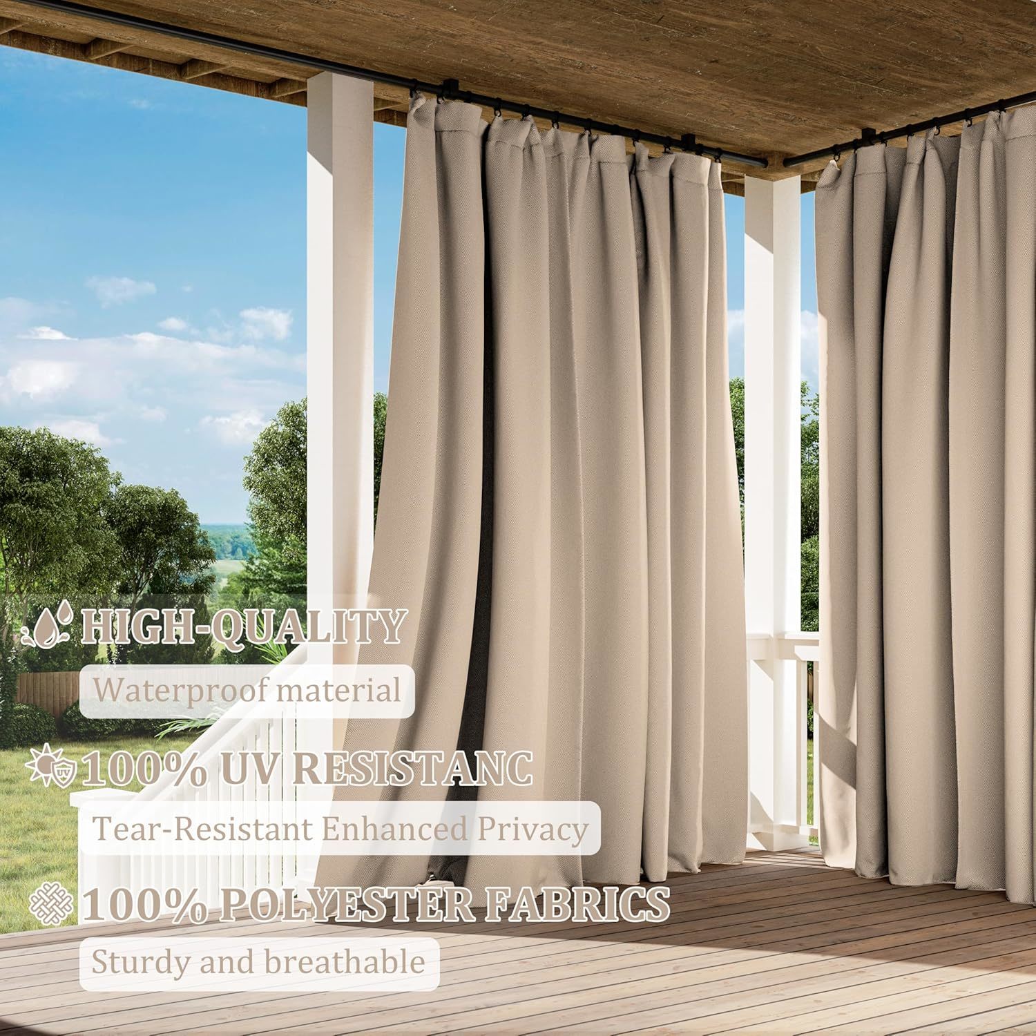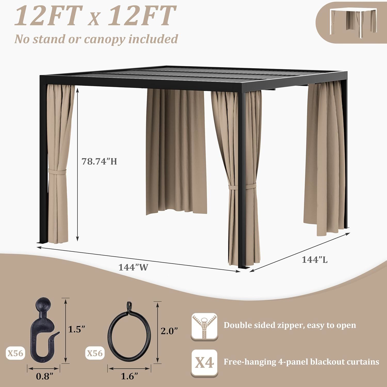 ?? Gazebo Universal Replacement Privacy Curtains ? Gazebo replacement curtains are made of polyester fabric to protect you from the sun on hot summer days,It also keeps the rain out, helping you spend quality time outdoors with family or friends while providing privacy and 100% breathability. ? Products Contained ? 4 Sidewall Curtains ? Lifting rings 56 pcs ? Hooks 56 pcs ? Unique Design ? Stable double-sided zipper ? Stable and strong straps ? Easy maintenance ? The gazebo curtains are easily removable and the quality fabric can be gently machine washed and washed in cold water then air dried.Or wring it out and hang it up to dry naturally. ? Products available in multiple sizes ? 10ft 10ft - 120"W x 120"L (Pack of 4) ? 10ft 12ft - 120"W x 144"L (Pack of 4) ? 10ft 13ft - 120"W x 156"L (Pack of 4) ? 12ft 12ft - 144"W x 144"L (Pack of 4) ? 12ft 14ft - 144"W x 168"L (Pack of 4) ? 12ft 16ft - 144"W x 192"L (Pack of 4) ? 12ft 20ft - 144"W x 240"L (Pack of 4)