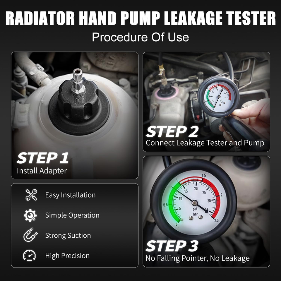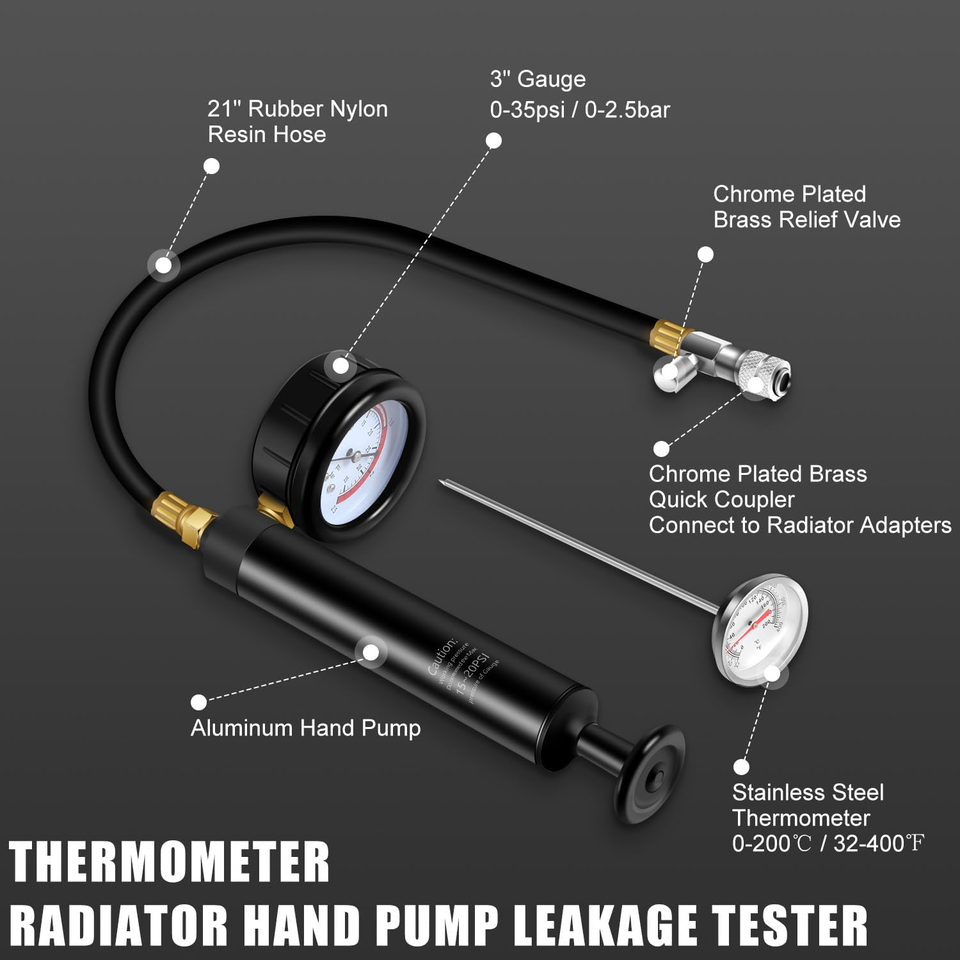 Coolant Leak Test: Radiator pressure tester pressurize on the reservoir or reservoir cap, and watch for pointer drop over time to confirm system leak down. Radiator coolant pressure test tool uses aluminum pump cylinder rather than plastic one, 21" rubber nylon resin hoses, brass fittings, solid and durable. 3" large dial gauge with index range 0 to 35 psi (0 to 2.5 bar), easy to observe