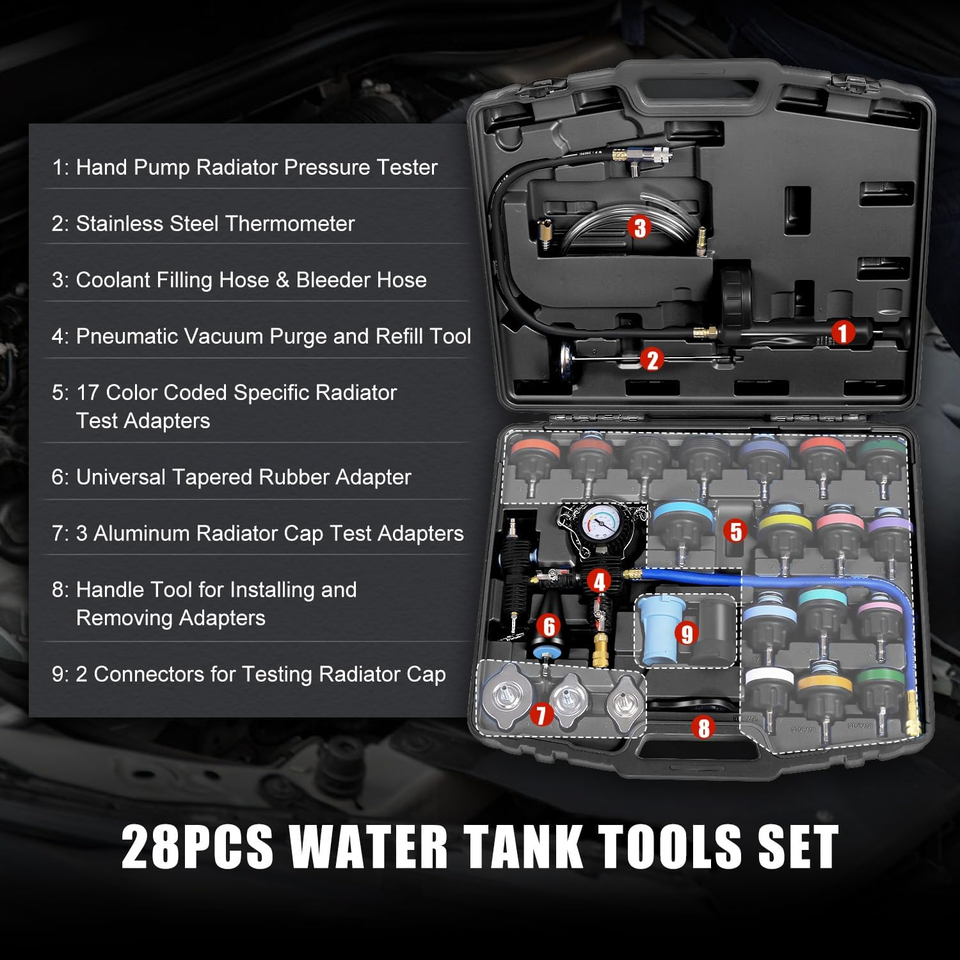28PCS Automotive Cooling System Leak Test and Pneumatic Purge Fill Set with Testing Adapter Caps Universal for Airlift Car Auto Truck
