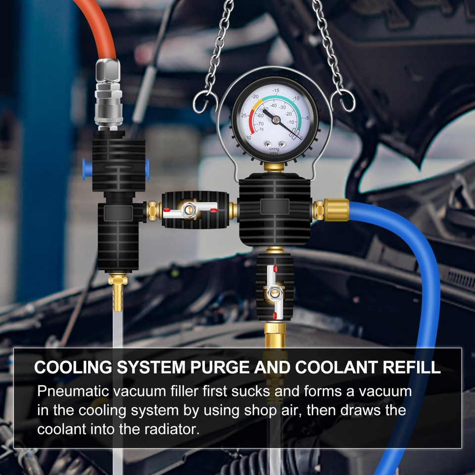 Vacuum Type Coolant Filling Function: Pneumatic vacuum coolant filler first sucks and forms a vacuum on the cooling system by using shop air, then draws coolant into the cooling system.(Need a vacuuming tool and not included in the kit) Add coolant in vacuum, there is no large air pocket and avoid warping or other damage in engine. Normally, it takes 5-10mins to refill the coolant, the exact time depends on the size of the tank. Easy to operate and save time