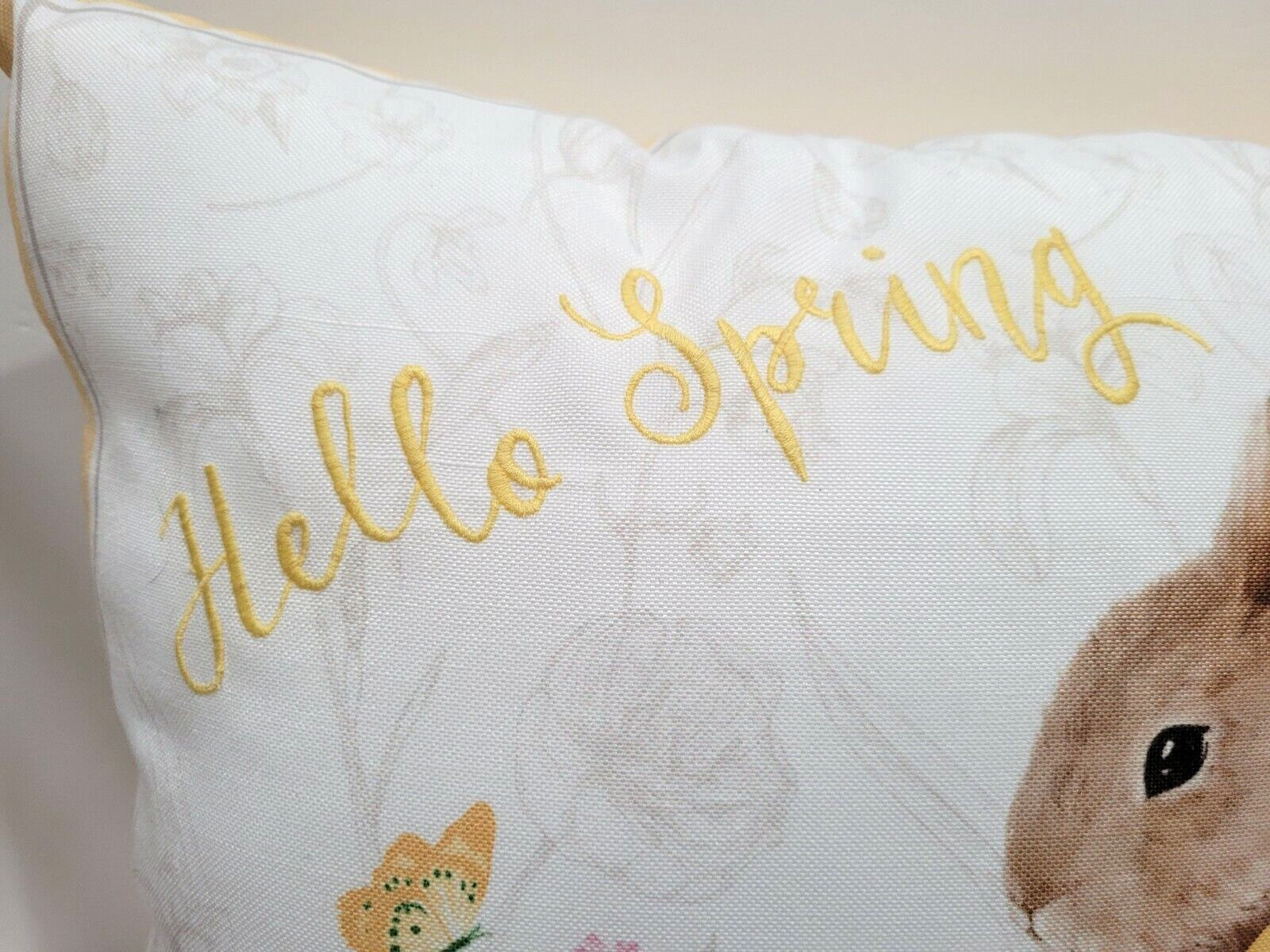 Up for sale we have this adorable pillow for your Easter decor. The pillow has a cute bunny rabbit riding a bicycle with flowers in her basket. The backside is a yellow/pick checkered pattern. Super cute pillow. Size 18x 18" New no tags.