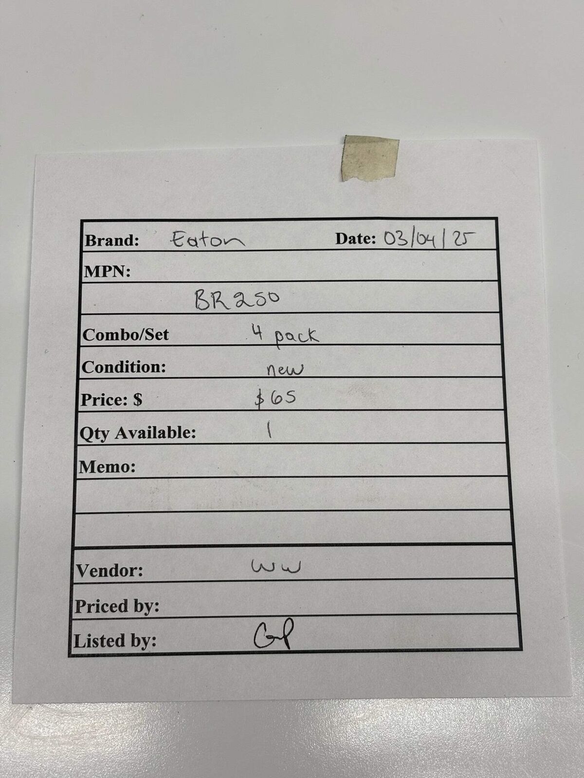 4-Pack Eaton BR250 Cutler-Hammer Double Pole 50 Amp Circuit Breaker Pack of 4. New, Good Condition. This thermal magnetic circuit breaker features a 120/240V voltage rating and provides a 10kAIC short-circuit interruption capacity at 240V. Designed for one-phase systems, it offers both long time and instantaneous trip functions to protect against overloads and short circuits. The plug-in design simplifies installation, making it an efficient solution for reliable circuit protection in various applications. Listed By: Gabe (The Help Resale Team) "Alone we can do so little; together we can do so much." - Helen Keller - (A positive moment brought to you by Help Resale) About Us Welcome to Help! Resale, your go-to consignment shop where value meets quality. At Help! Resale, we're dedicated to providing you with an exceptional shopping experience, whether you're looking to find the best deals or consign your gently used items. Need to buy a product, but don't see it in our store? Please feel free to reach out to us and we will help you find it! Help Resale 7200 Fair Oaks Blvd Suite 120 Carmichael CA 95608 Business Hours: Monday-Friday: 9:00 am to 5:00 pm (PST) All product and company names are trademarks TM or registered trademarks of their respective holders. Use of them does not imply any affiliation with or endorsement by them.