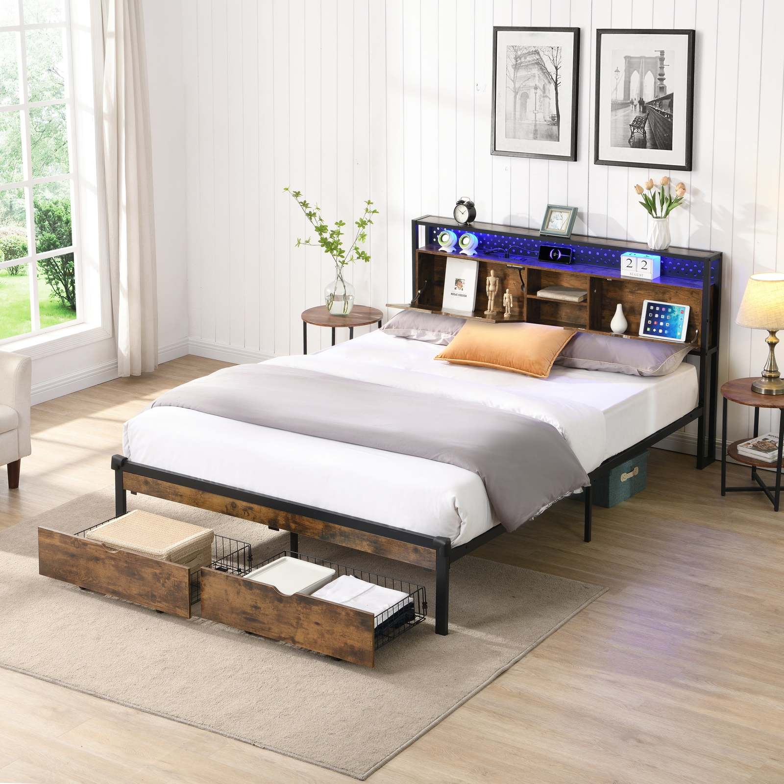 Queen Metal Platform Bed Frame w/ Headboard, Storage, USB