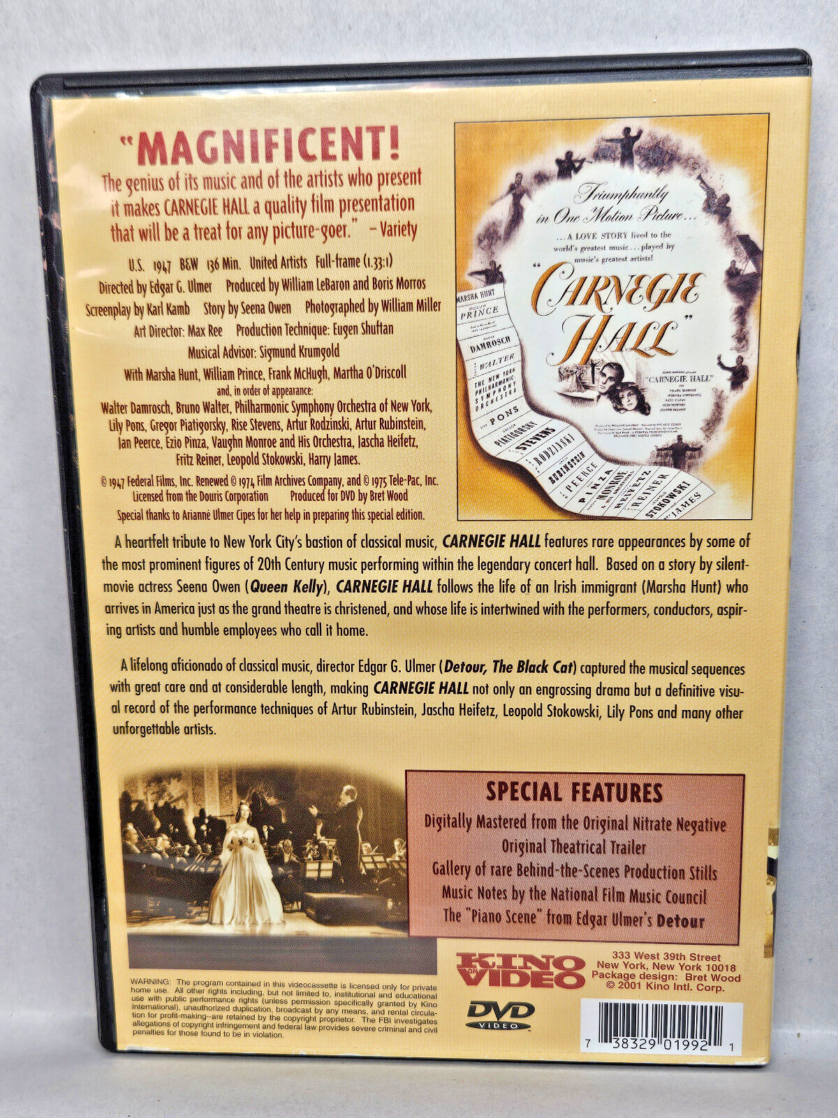 Carnegie Hall (1947, DVD) KINO VIDEO 2001 Release