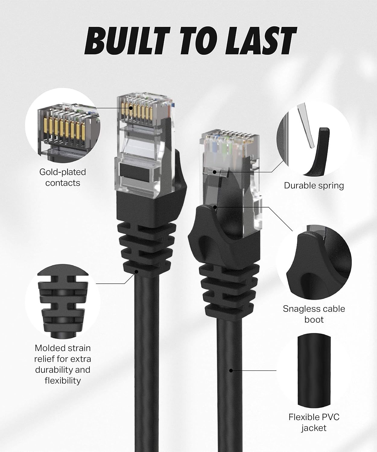 QUALITY CONTROL - Each Cat 6 internet cable 3 ft goes through rigorous testing to ensure a secure wired internet connection with exceptional speed and reliability. PERFORMANCE - High performance Cat6 ethernet patch cables are designed with extremely well-matched components for outstanding uniform impedance and very low return loss, providing lower crosstalk, and a higher signal-to-noise ratio. They support frequencies of up to 500 MHz and are suitable for high-speed 10GBASE-T internet connection for LAN network applications such as PCs, servers, printers, routers, switch boxes, and more, while remaining fully backward compatible with your existing network. CERTIFICATION - Cat6 Ethernet cable with CM grade PVC jacket complies with TIA/EIA 568-C.2, is ETL verified and RoHS compliant. CONFIGURATION - The 3 feet cat 6 ethernet patch cable features 8 solid copper conductors 24 AWG. Each of the 4 unshielded twisted pairs (UTP) are separated by a PE cross insulation to isolates pairs and prevent crosstalk and covered by a 5.8mm PVC jacket with RJ45 connectors and gold-plated contacts. The molded strain relief boots help avoid snags that will damage your cables. They are molded for flexibility and resist common wear and tear. SUPPORT ? Ultra Clarity Cables are designed to last. If an item is defective or breaks within a year, we will issue a replacement. For questions or concerns please contact our friendly, USA-based customer support team.