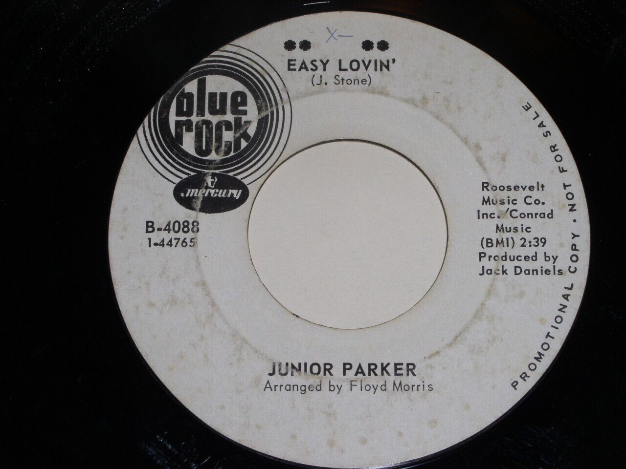 This is a vintage white label promotional 45 rpm phonograph record by Junior Parker, entitled, "Easy Lovin". Flipside: "You Can't Keep A Good Woman Down". Record label: Blue Rock B-4088.