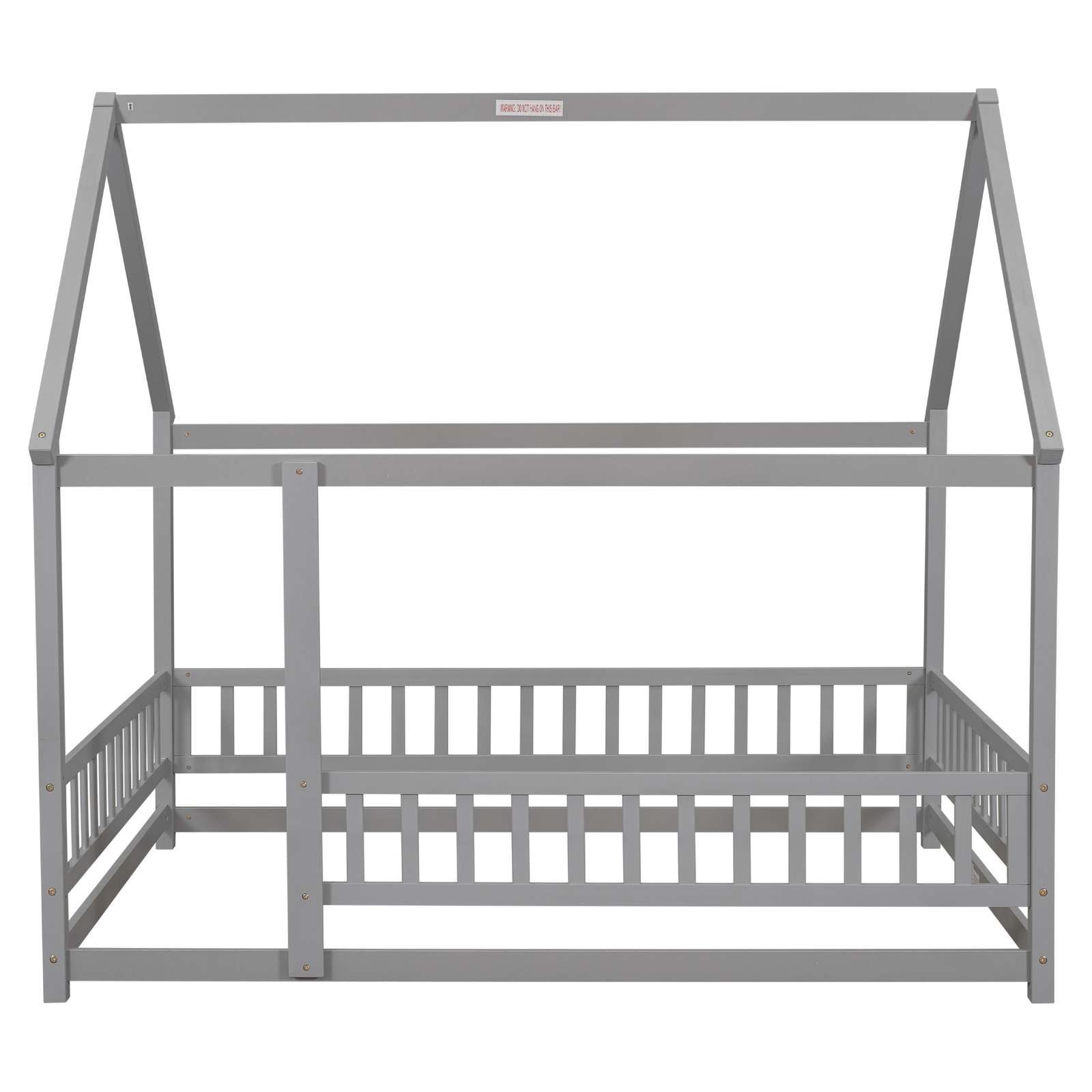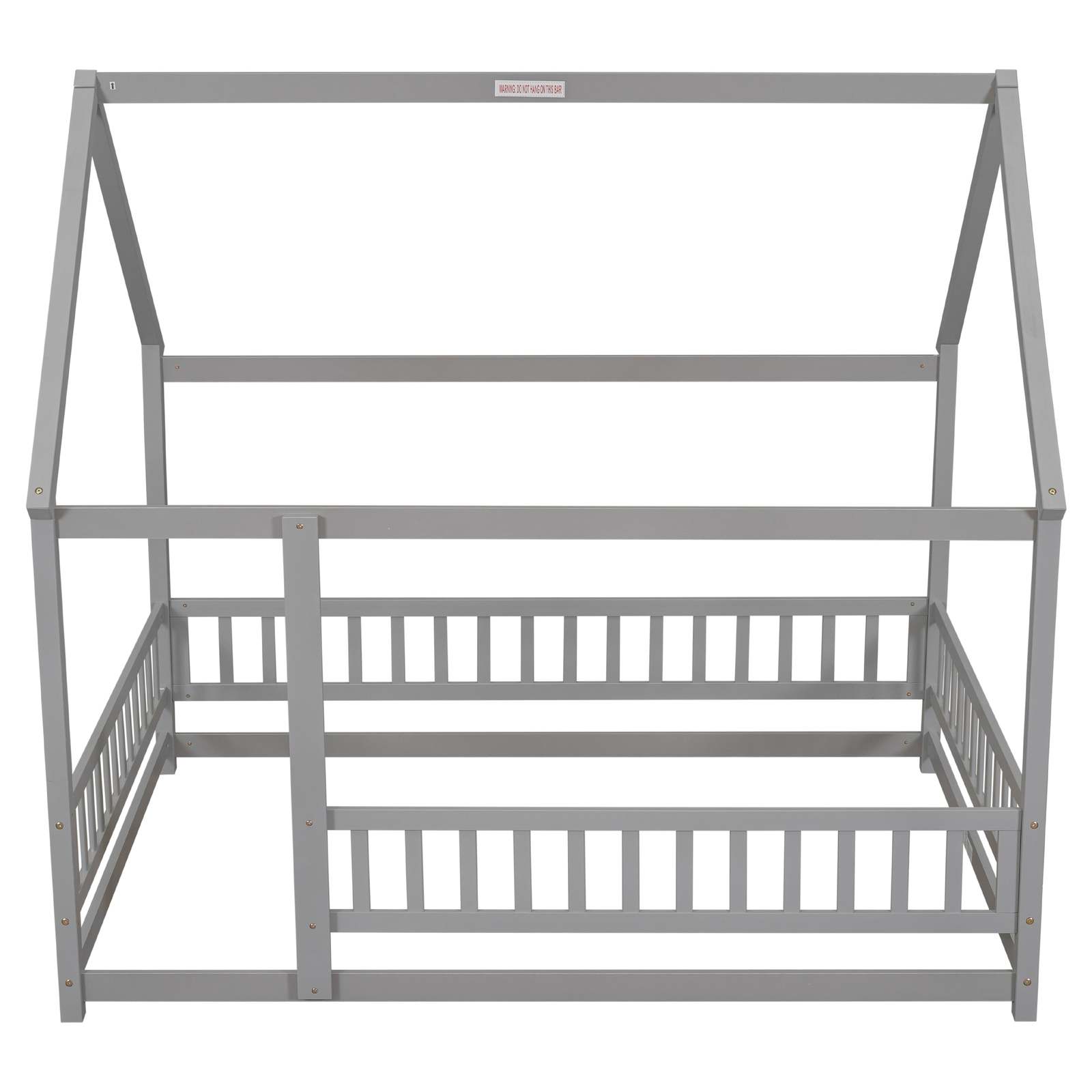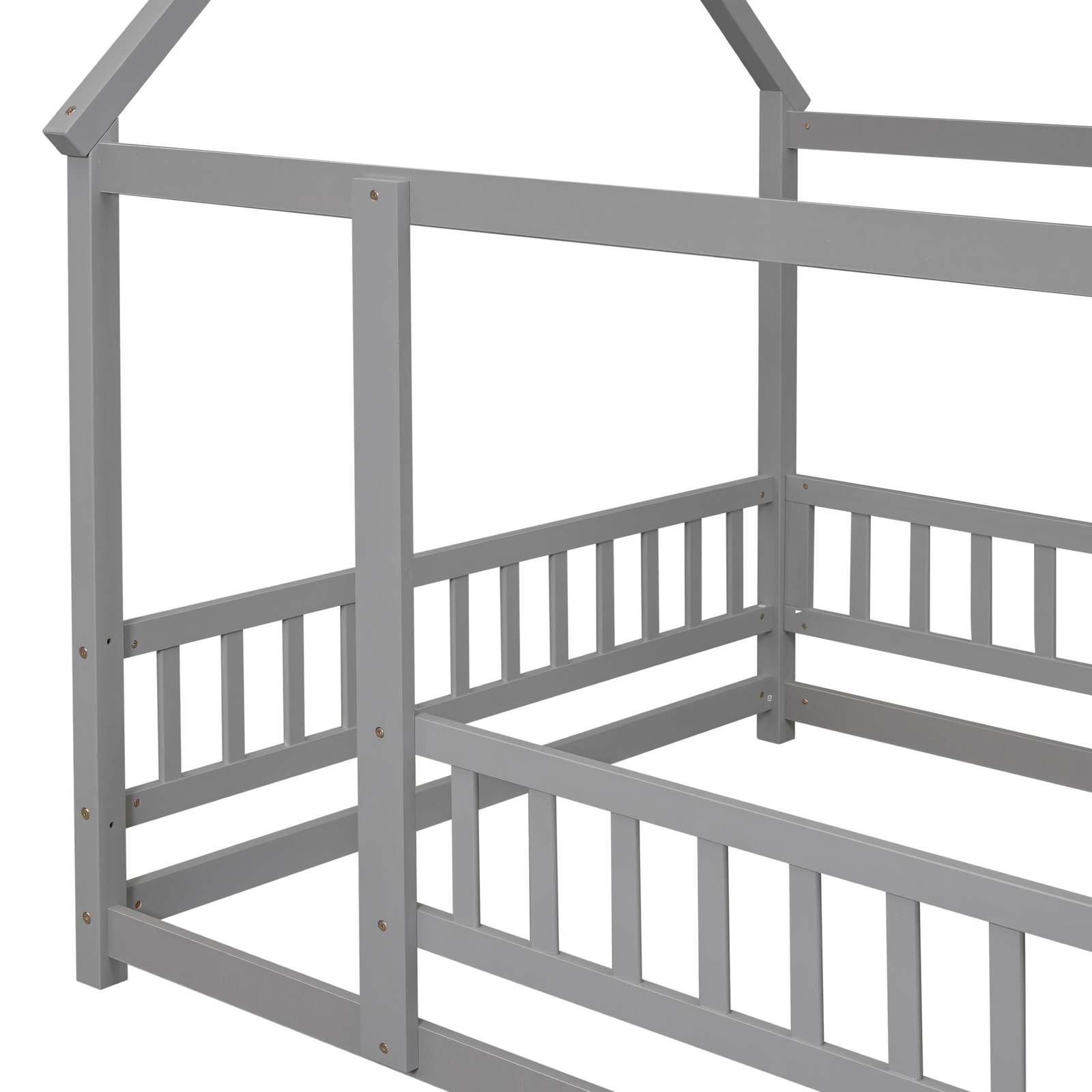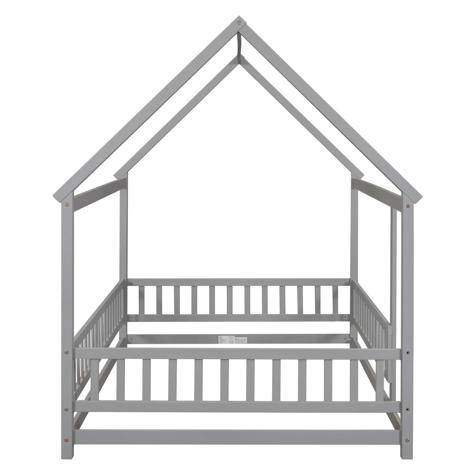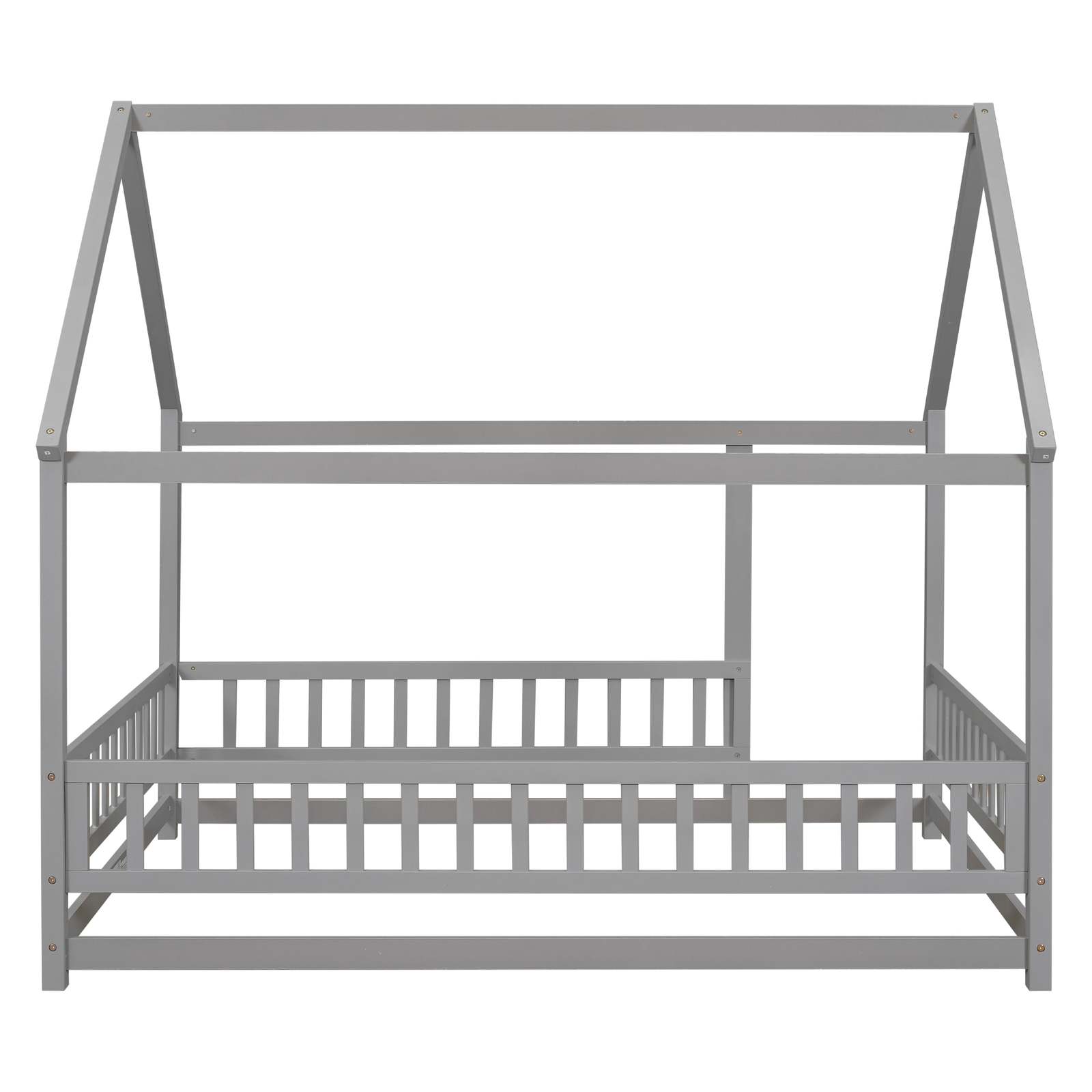 Full Size Floor Wooden Bed with House Roof Frame, Fence Guardrails ,Grey