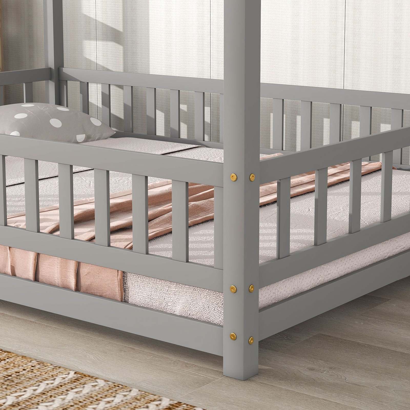 [Floor Bed with Fence Design] This floor bed featuring fence not only ensures better stability but also reduce safety concerns, offering the restful nights of sound sleep. In addition, the fence and roof frame are designed with an attracting structure to provide a solid and comfortable support when you put a mattress on the floor.